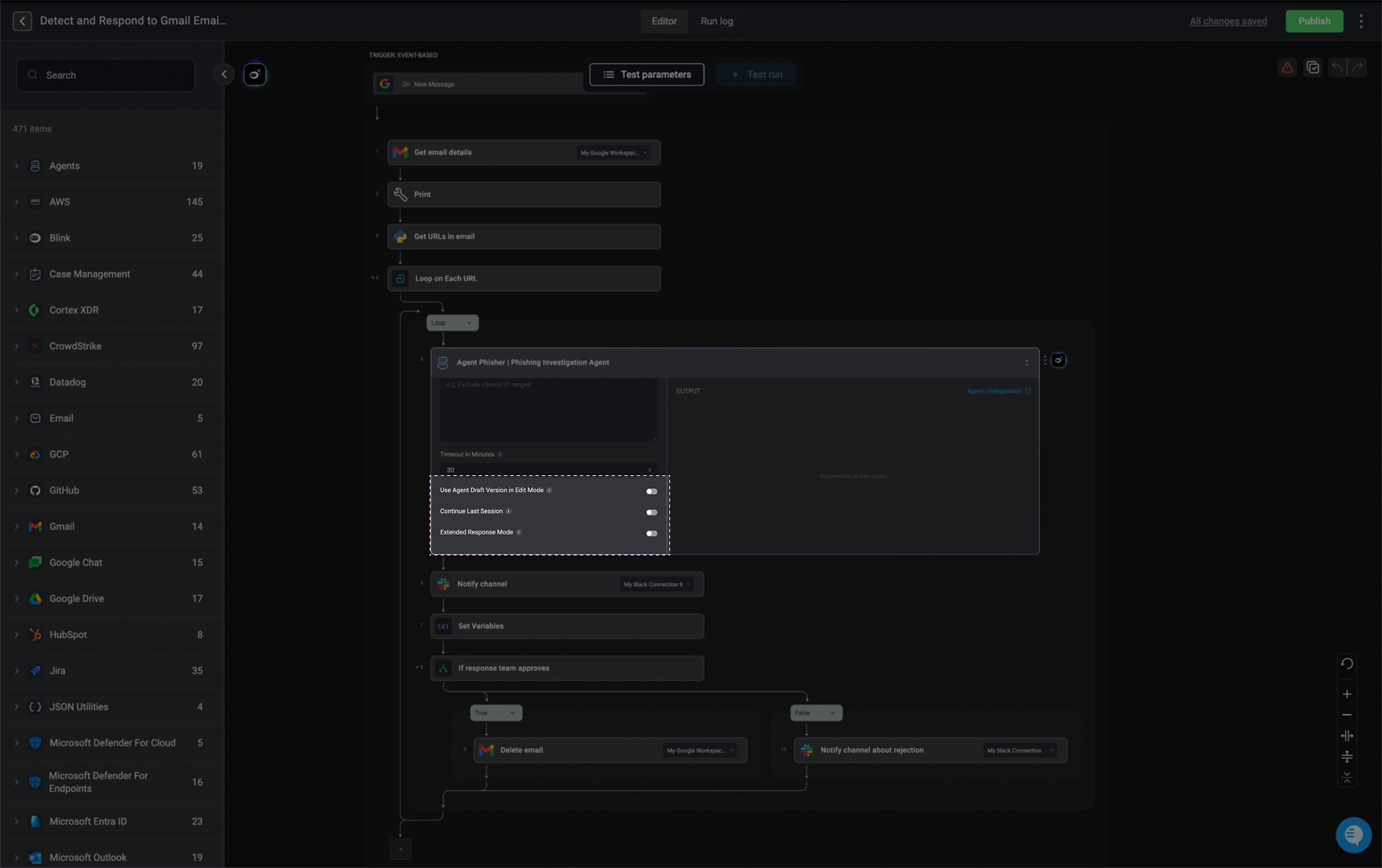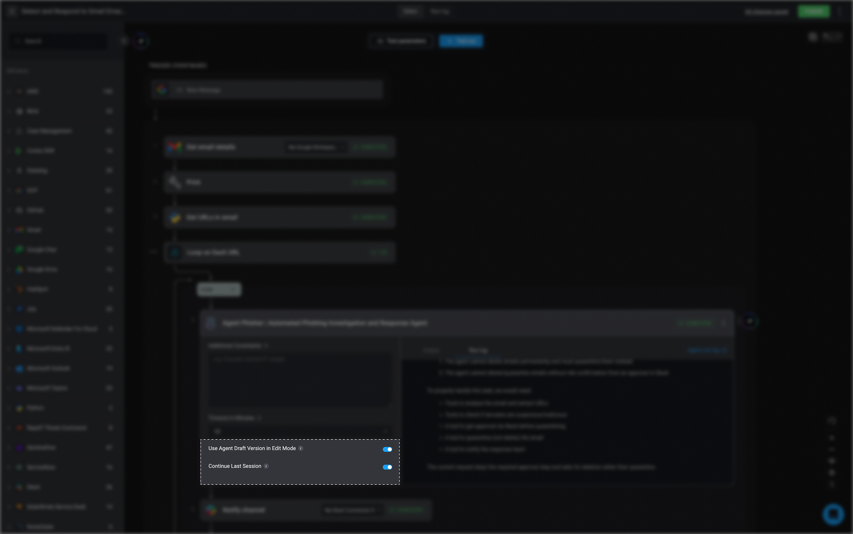 - Use Agent Draft Version in Edit Mode: When enabled, the workflow will run the draft version of the agent while in edit mode and during test runs. This lets you test the workflow using the most recent, unpublished changes made to the agent, so you can validate updates before officially publishing them.