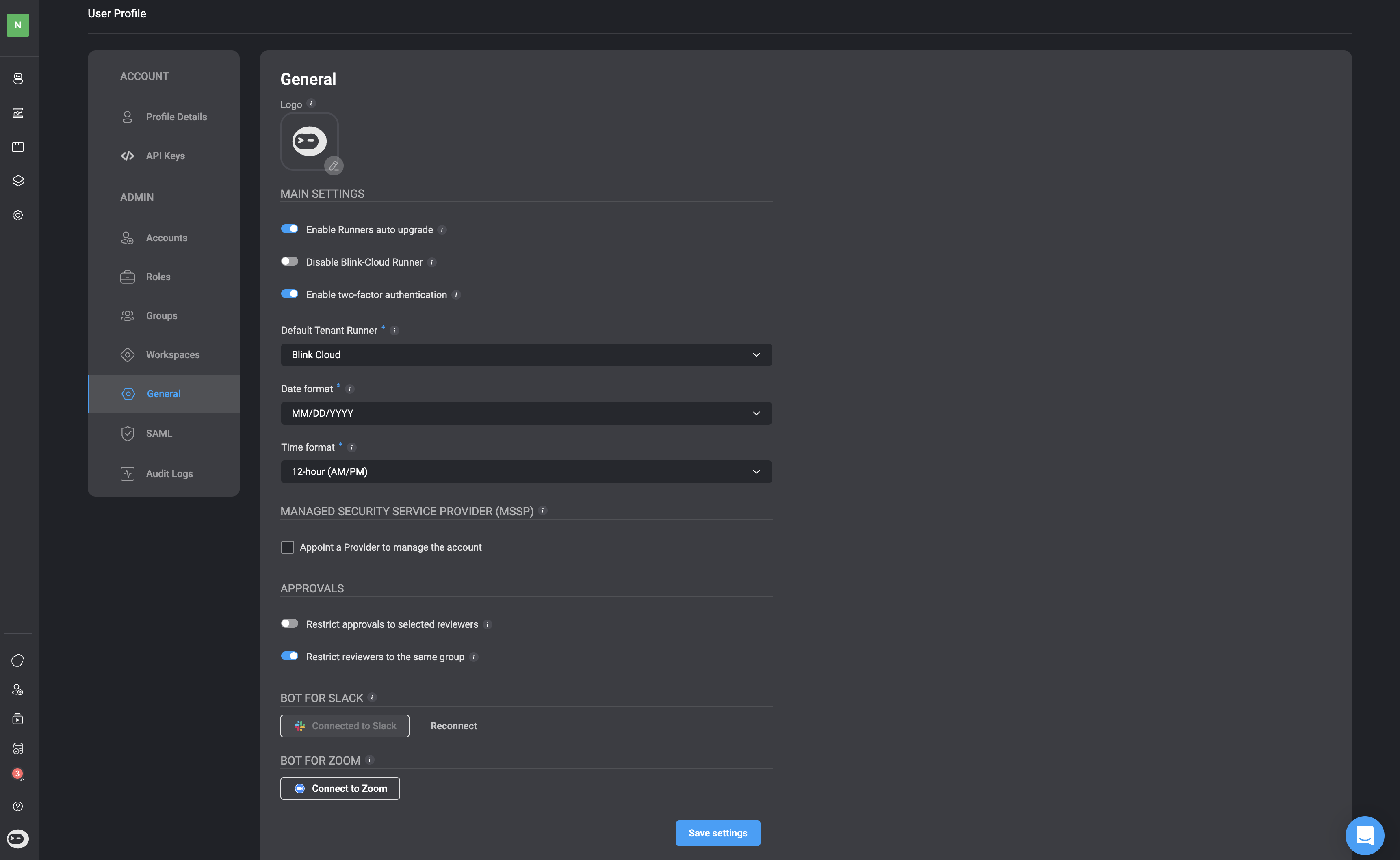 In the General tab of account settings, you can apply various configurations to your Blink Ops account. See General Settings for details.