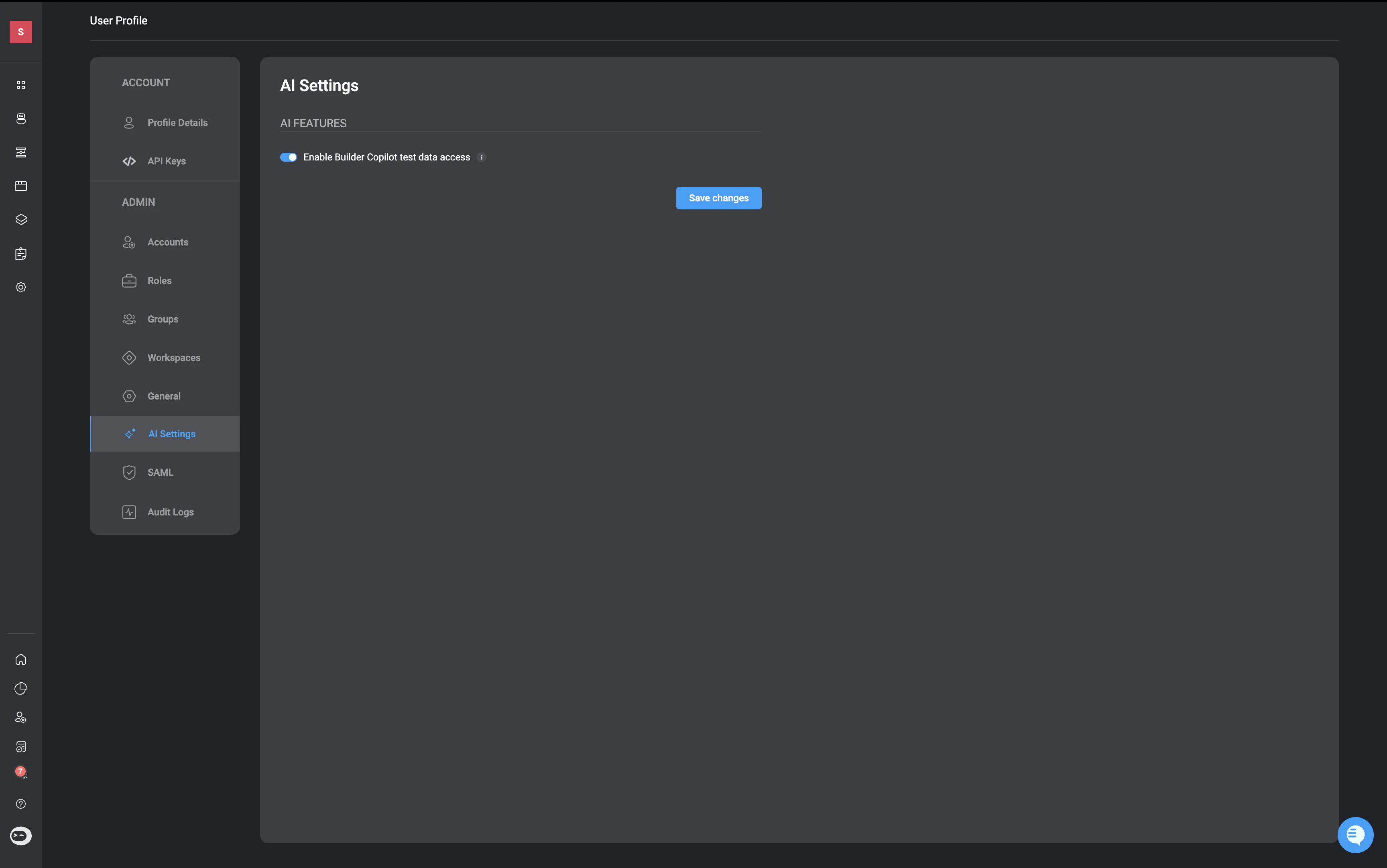 Enable Builder Copilot test data access – When enabled, the Builder Copilot can access workflow testing execution data from the current session to generate more context-aware and precise configuration suggestions. If a step produces an error in its output, you can ask Builder Copilot to fix it, with the error message included in its context for more accurate and effective resolutions. When disabled, suggestions are based only on the workflow definition and user input.