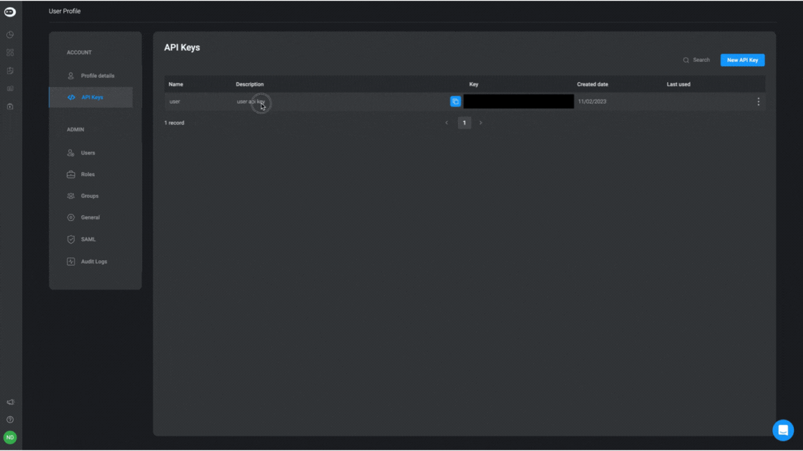 - If you want to delete an API Key, click on the icon on the right-hand side of the row and select the delete option.