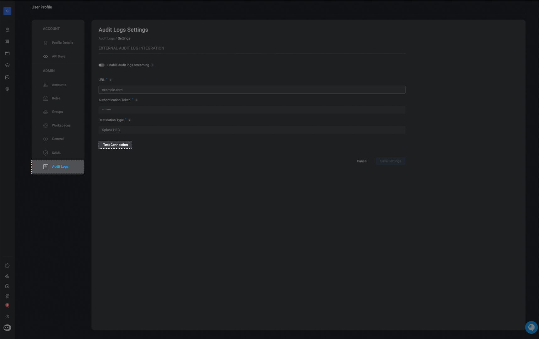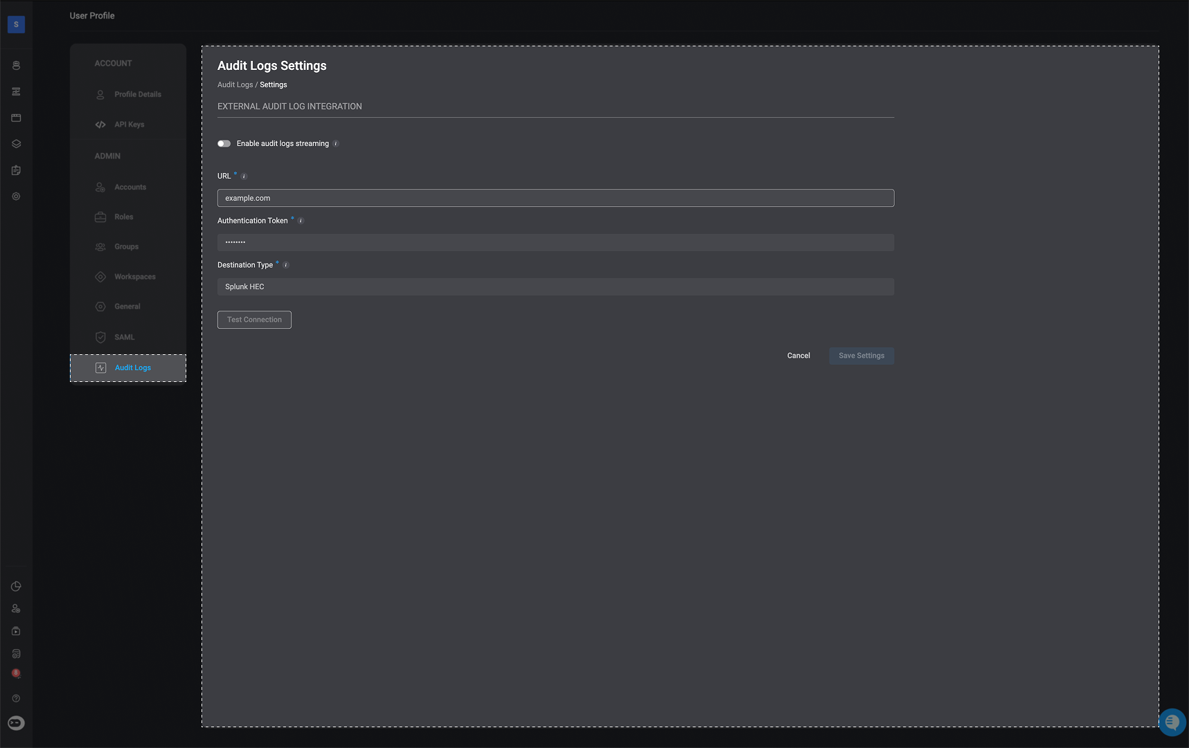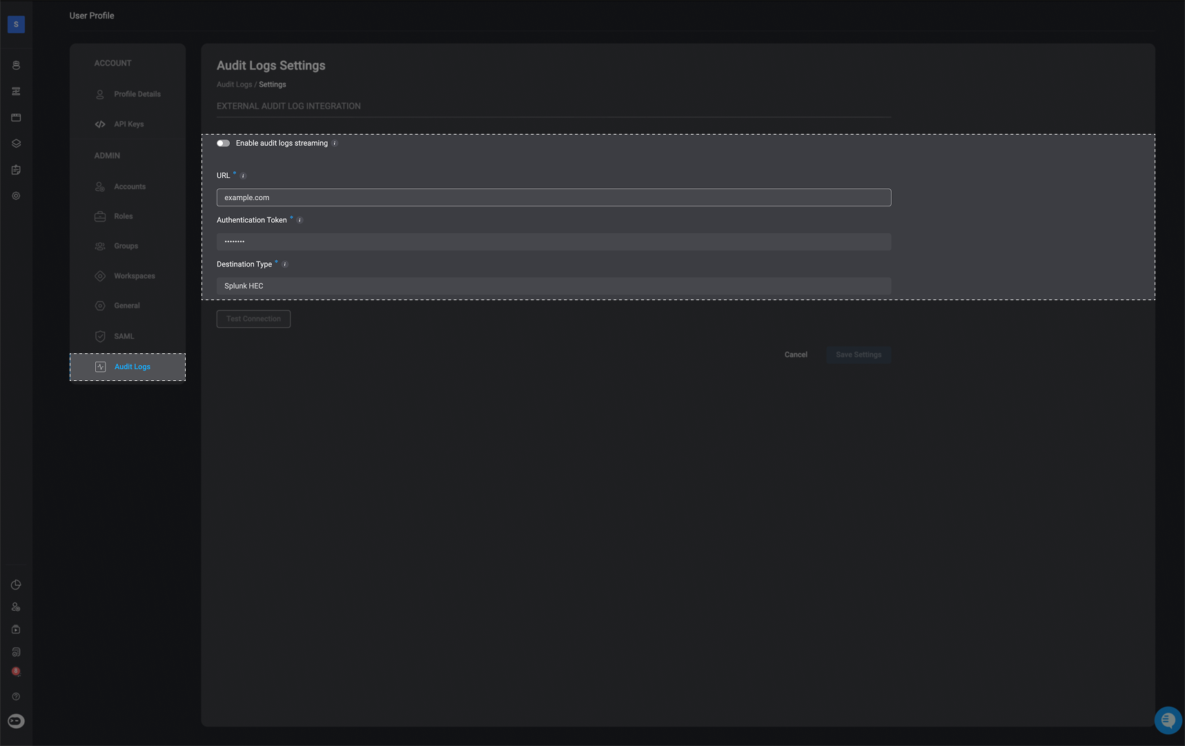 - When enabled, audit logs will be delivered to your specified external destination in real time.