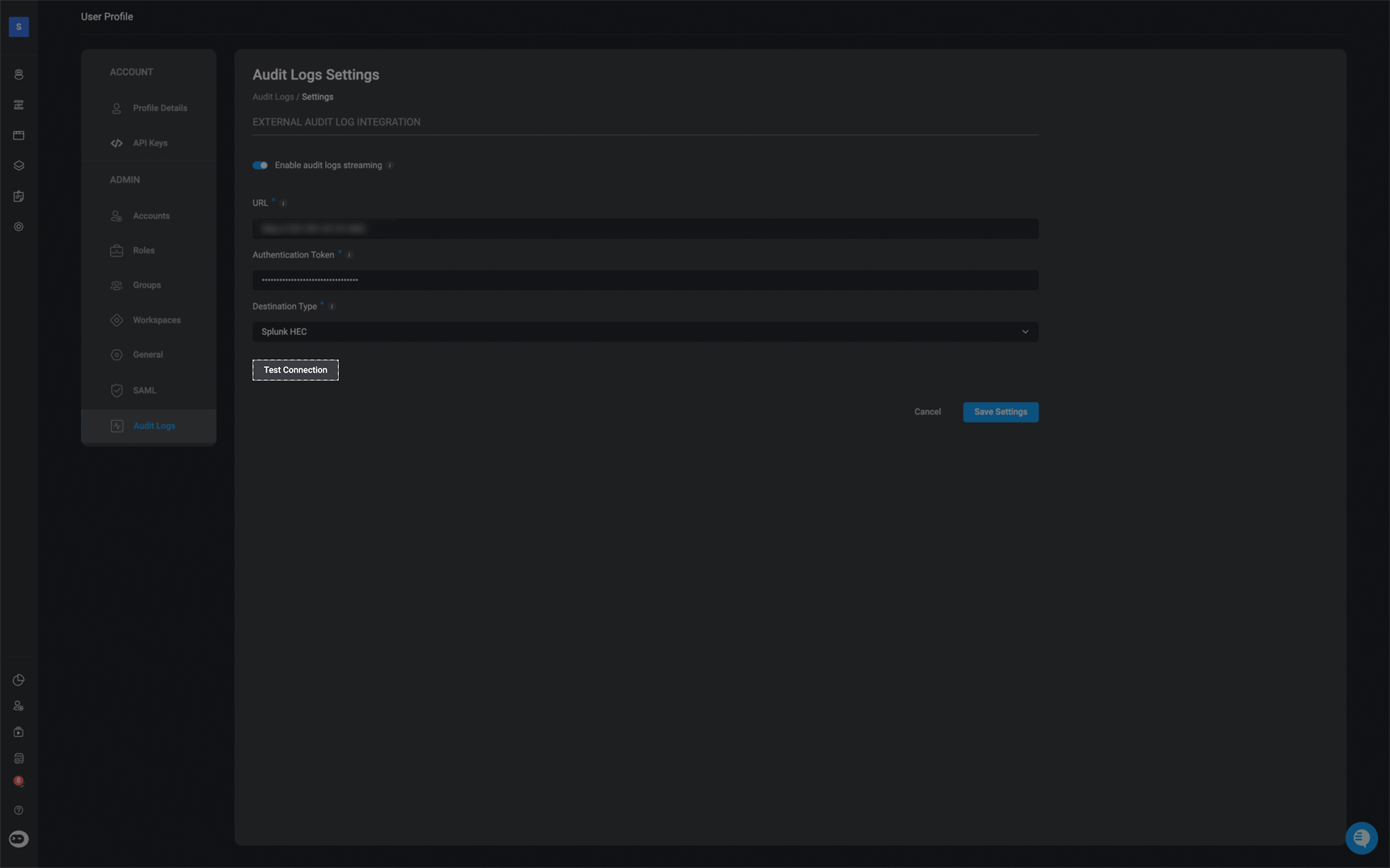 Click Test Connection to verify that the URL and token have been entered correctly and that Blink can successfully communicate with your Splunk instance. Once the connection is validated, click Save Settings to apply the configuration.