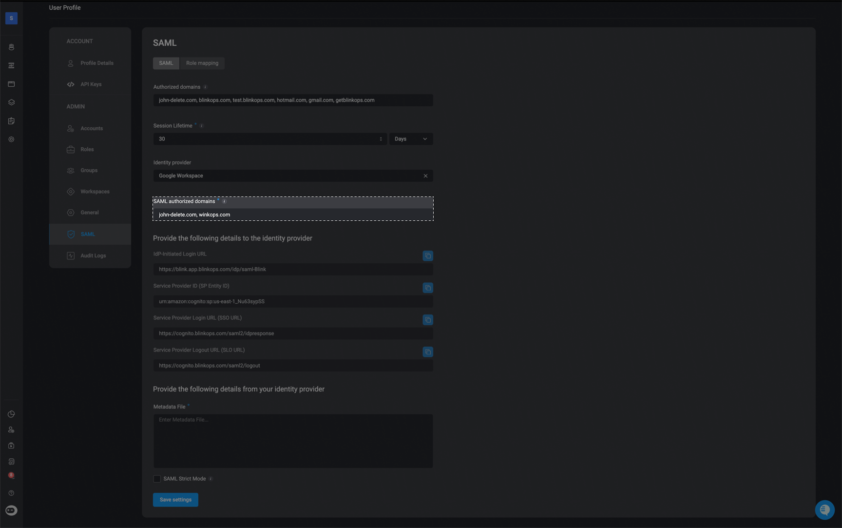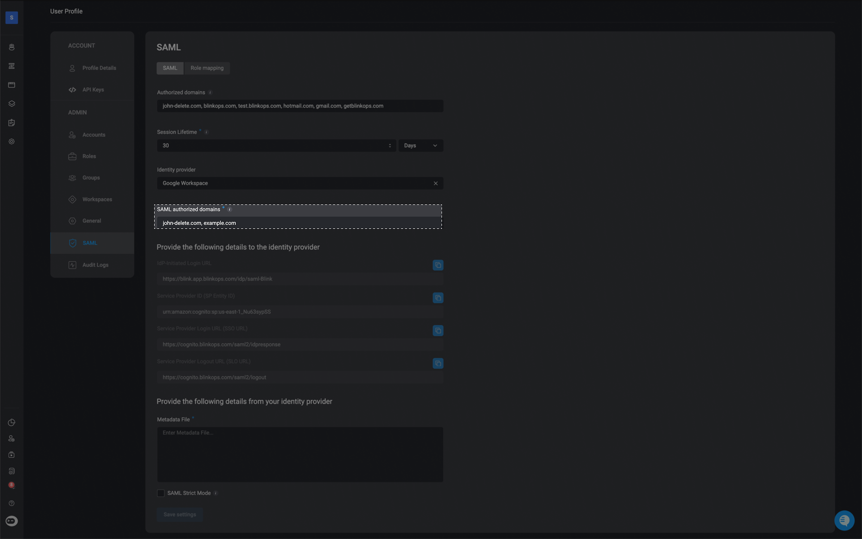Choose weather you would like to enable SAML Strict Mode by checking the box. When enabling SAML Strict Mode , all organization users who are not administrators must use SAML to sign in to Blink. Admins retain access to alternative sign-in modes for trouble shooting purposes.