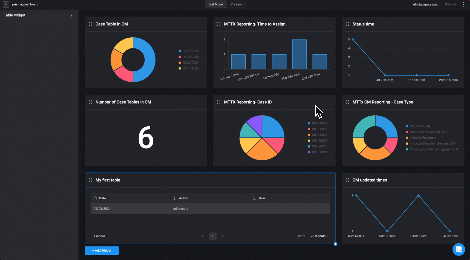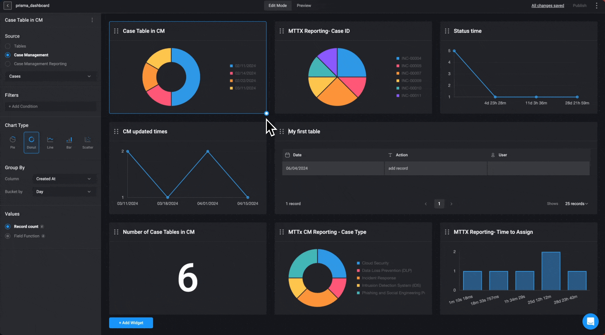 The Dashboard Building Interfaces reflect your underlying source data and are represented by different types of widgets. Widgets are the essential building blocks of the Dashboard Building Interfaces. Widgets enable you and other collaborators to see and interact with your table’s data in real time.Dashboard Building Interface Tabs