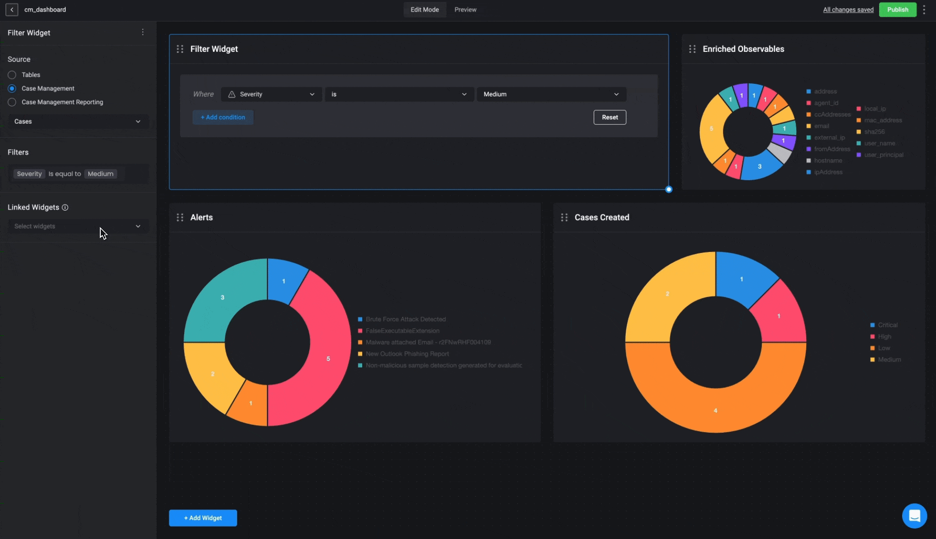 - Lastly, connect your Filter Widget to the widget you want to filter. In the following example, the filter widget is connected to a bar graph displaying case data. The filter is set to show only cases with a “medium” severity level, demonstrating how the widget updates to reflect the applied filter.