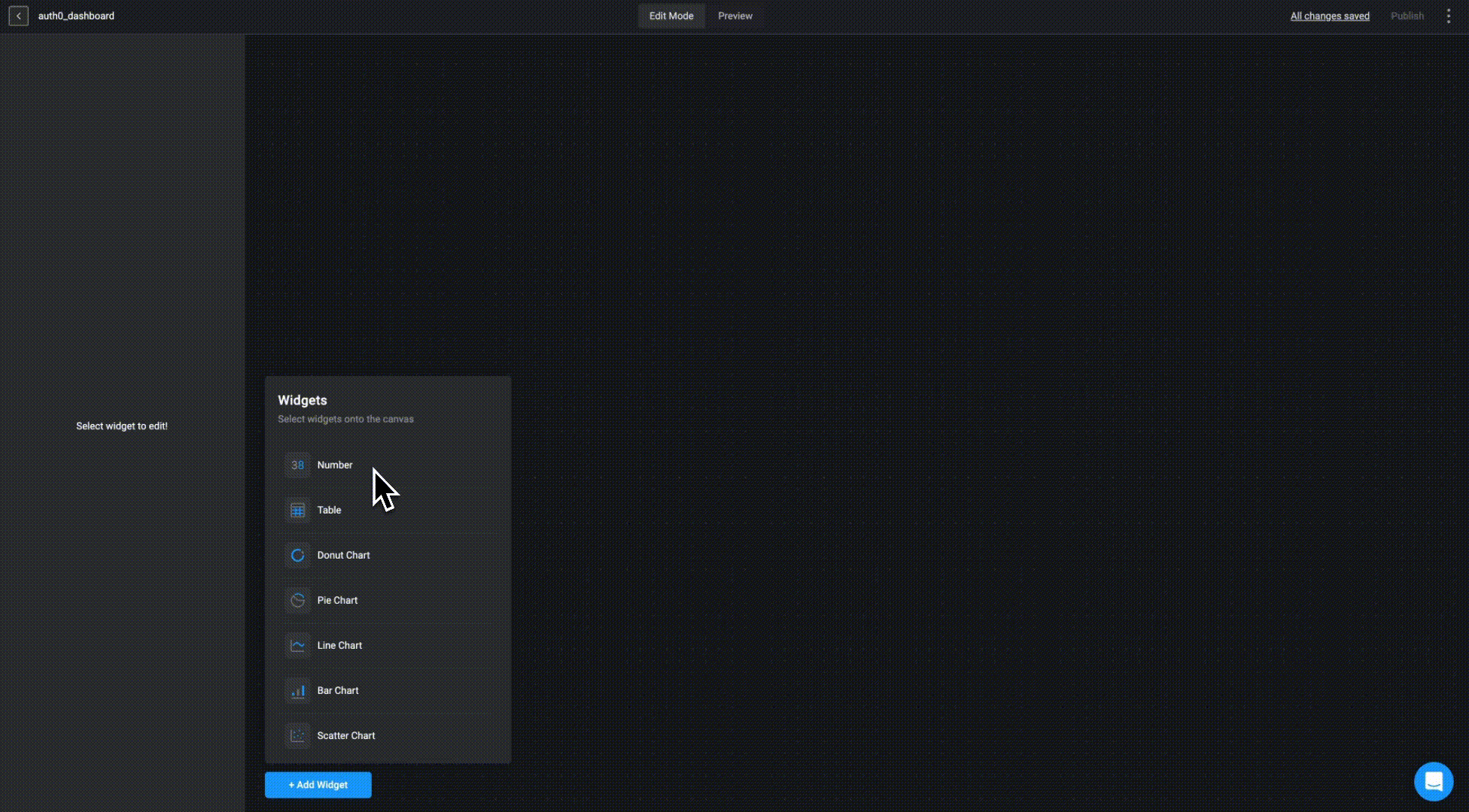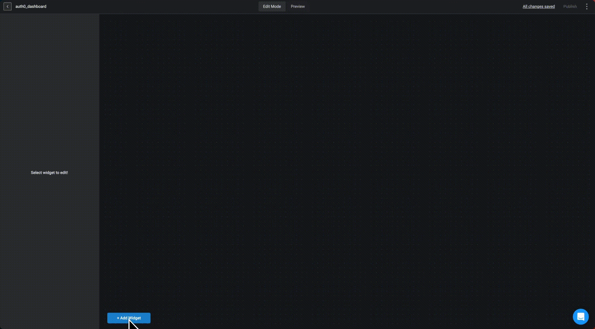 - In the Edit Mode tab of the Dashboards Building Interface, click the “add a widget” button.