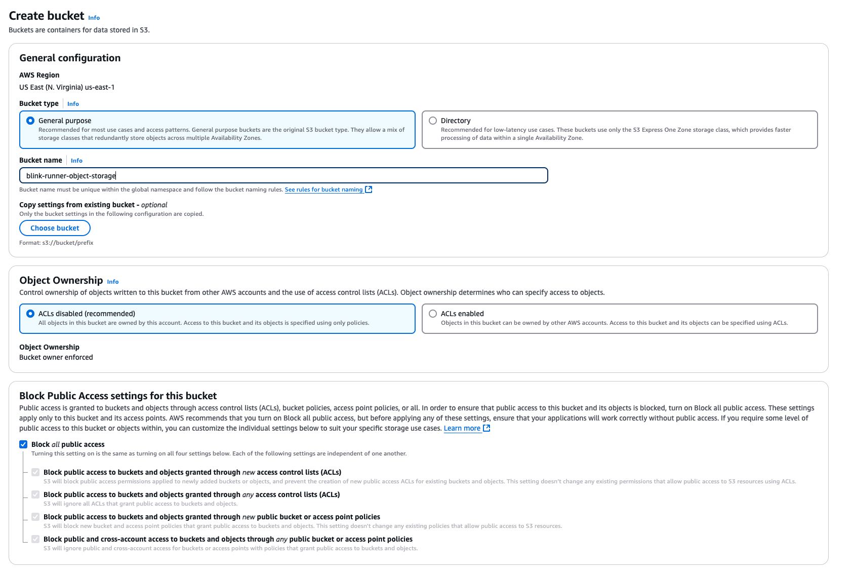 Bucket Name: Enter a unique name for your bucket. For example: blink-runner-object-storage.