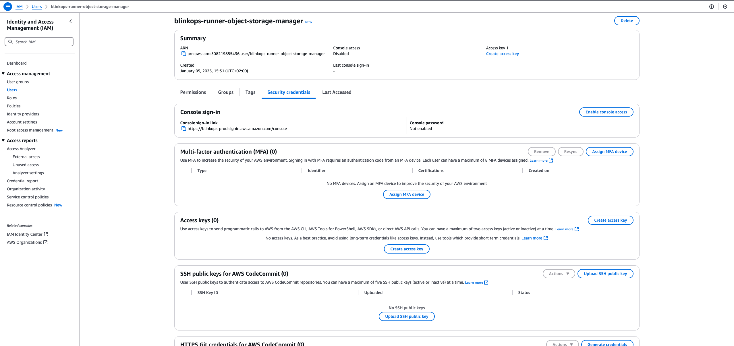 Create an Access Key: In the Access keys section, click the Create access key button and follow the steps: