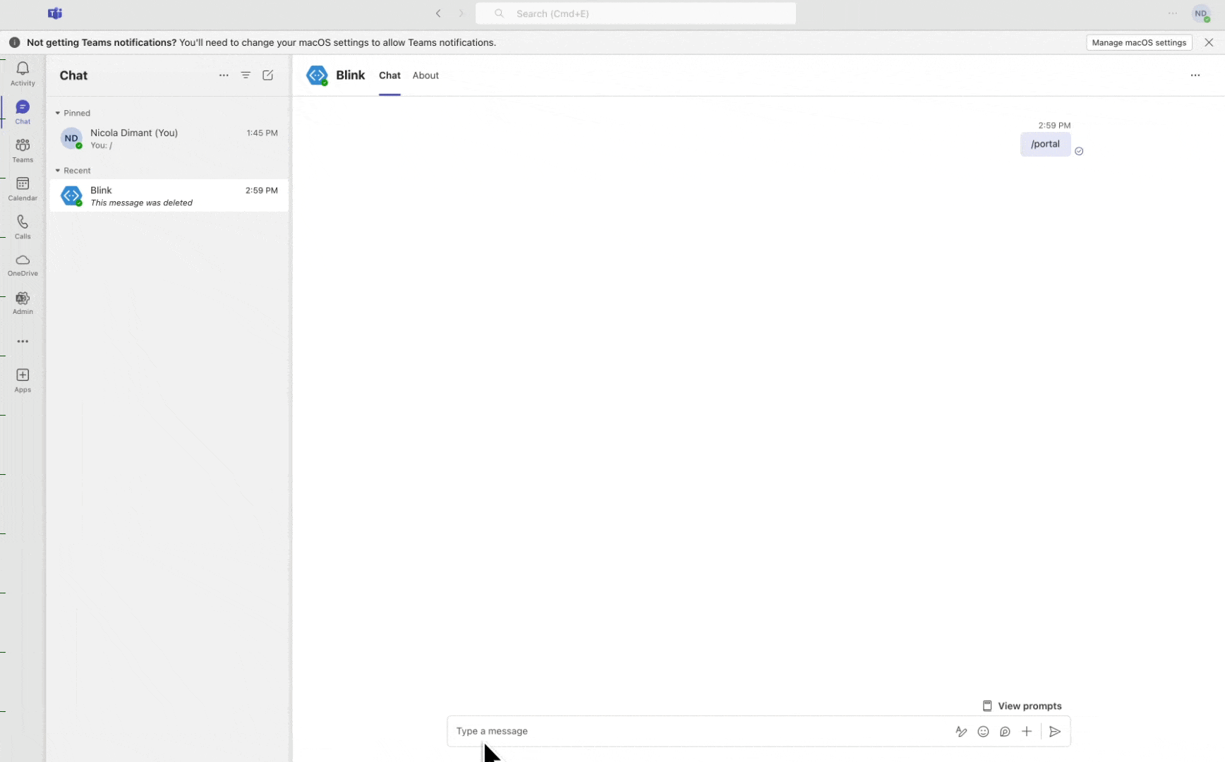 - In your teams app, navigate to the Blink App and start a conversation by entering /portal.
