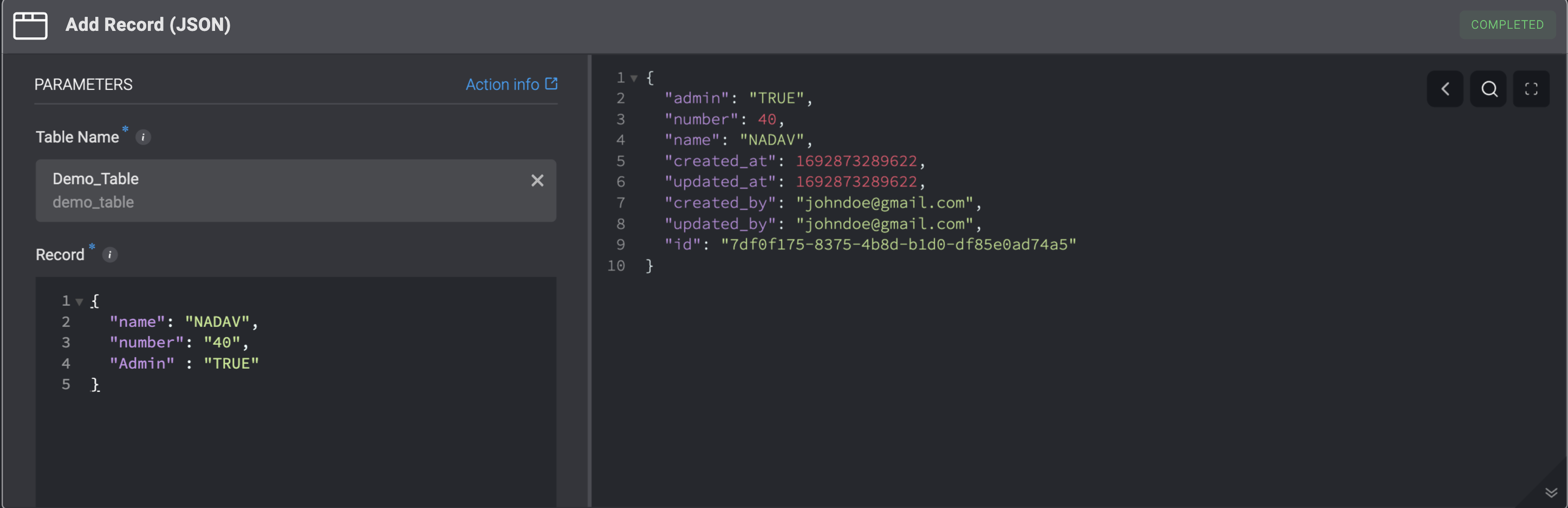 Add new records to a table by entering field names and values or by providing data inJSON format.JSON input supports bulk creation, allowing multiple records to be added simultaneously in a single action.
