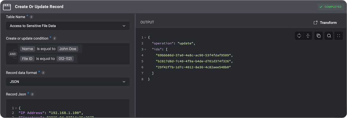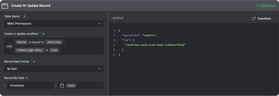Scenario: You are building a system to monitor user login attempts. If a user fails to log in multiple times within a short period, you want to flag their account as potentially compromised, but you don’t want to duplicate records for each failed attempt.Solution: Use the Create or Update Records action to update the record for failed login attempts instead of creating a new record for every failure.Set a condition in the Create or Update Records action to check if the user already has a record of failed login attempts.