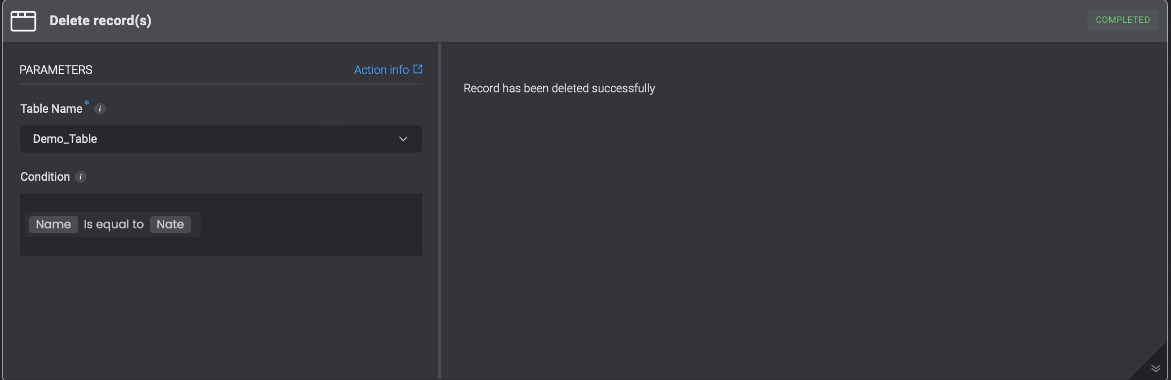 | Record ID | The record unique identifier. Can be obtained via the Select action. |