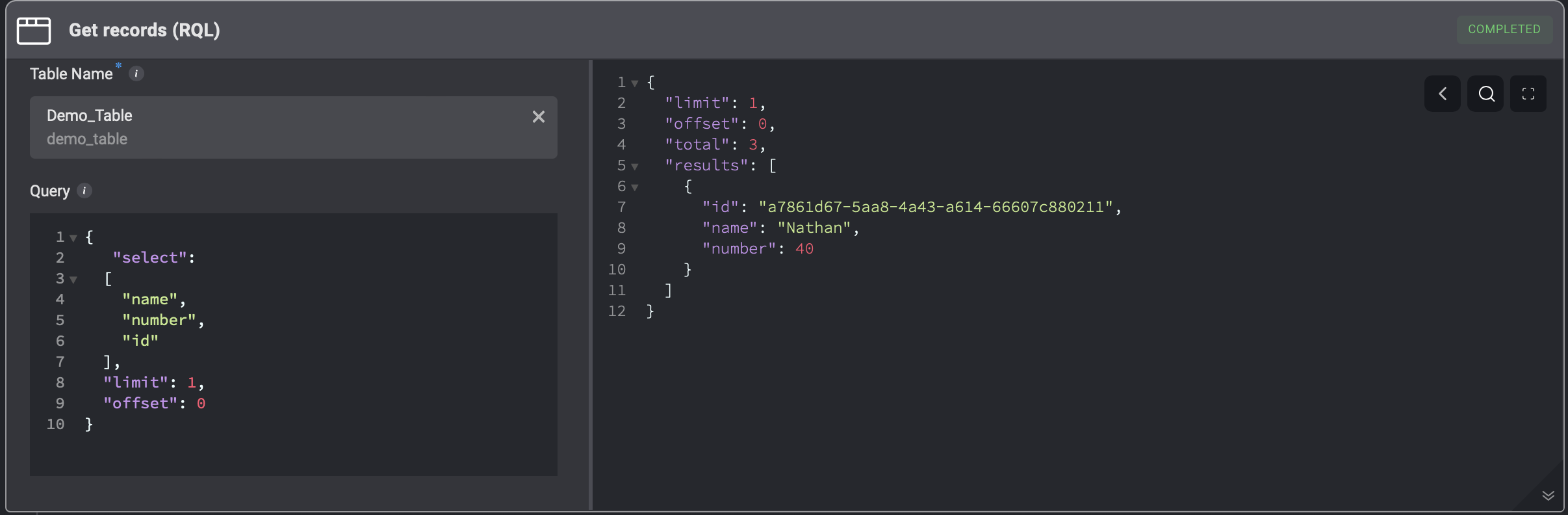Fetch table data based on specified criteria using conditions, RQL queries, or SQL queries. Choose how the data is structured in the output (Table, JSON, or CSV) and refine results by applying filters, sorting, limits, and pagination options.Tip: When to Use Each Query Method