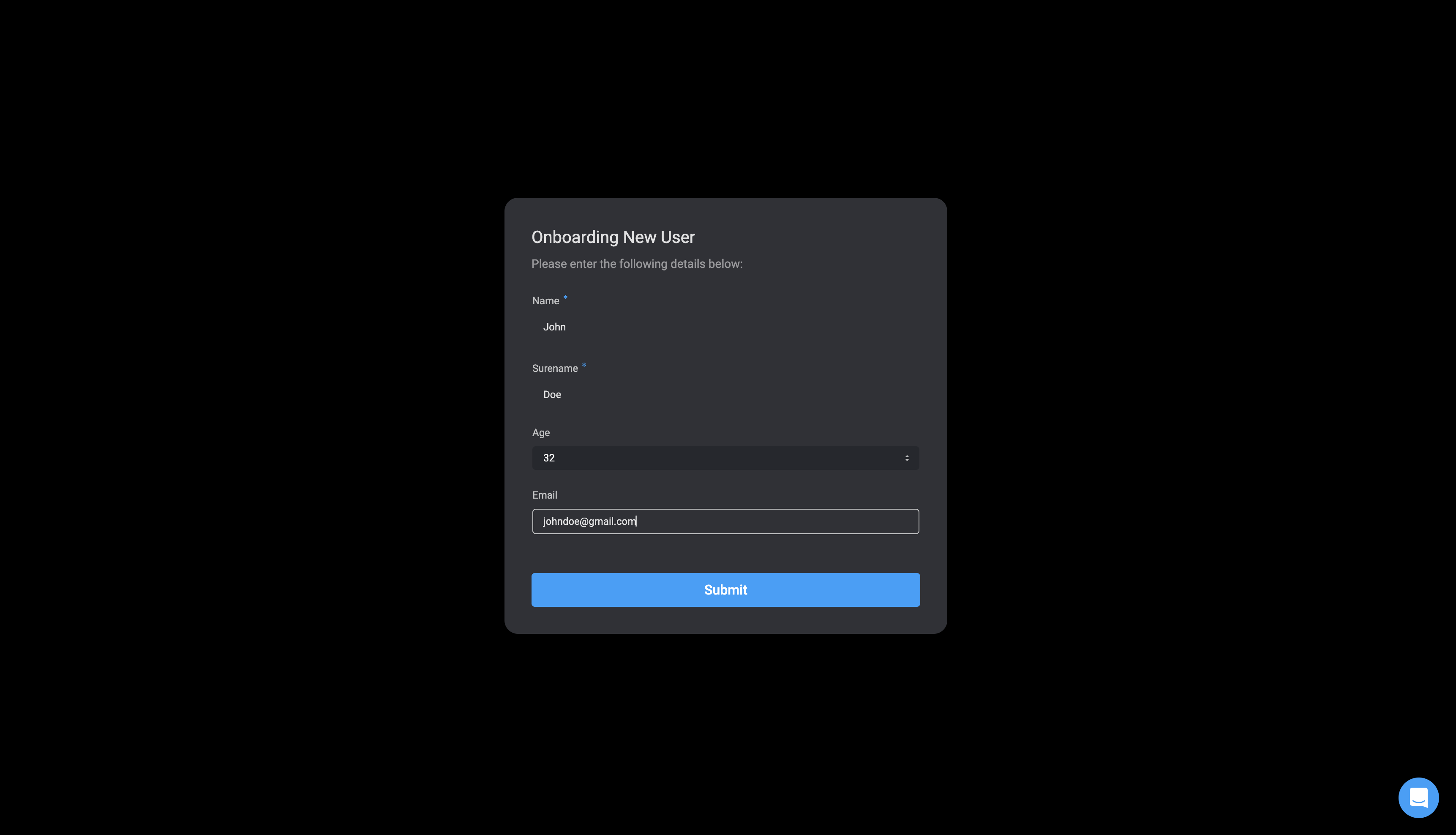 A new browser tab will open, displaying the Web Form you just created. Fill out the form and click Submit.