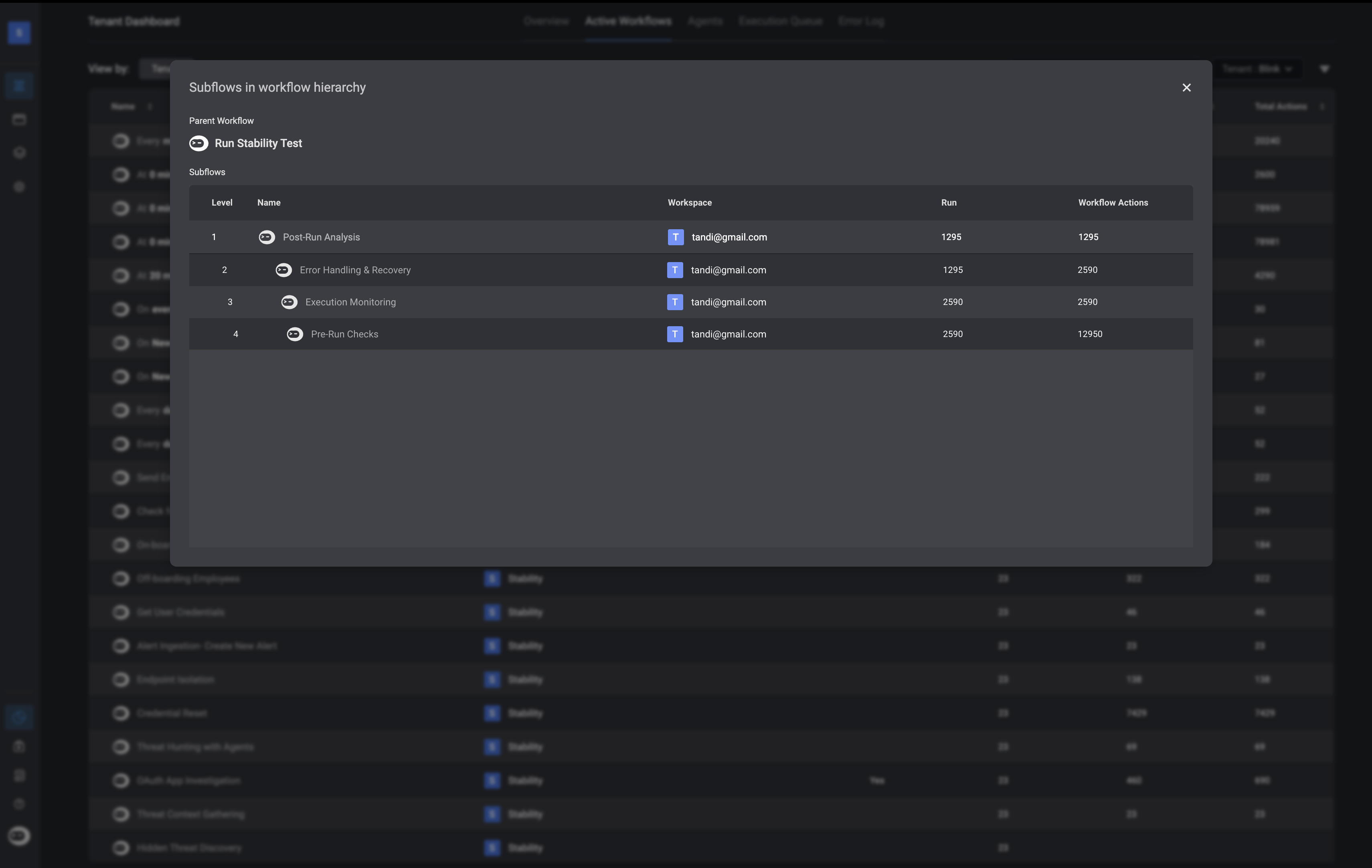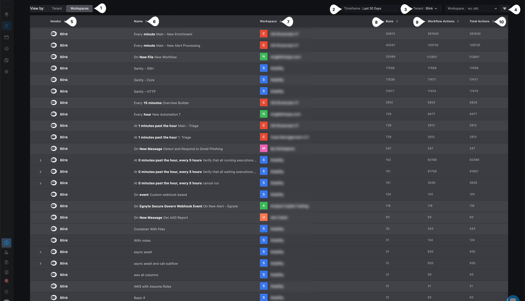 The Active Workflows section provides detailed visibility into which workflows are being executed, how frequently they run, and the total amount of actions executed in a workspace and tenant. This view helps teams identify high-usage workflows, track vendor utilization, and assess performance across tenants and workspaces, enabling better prioritization, optimization, and scaling of automation efforts.