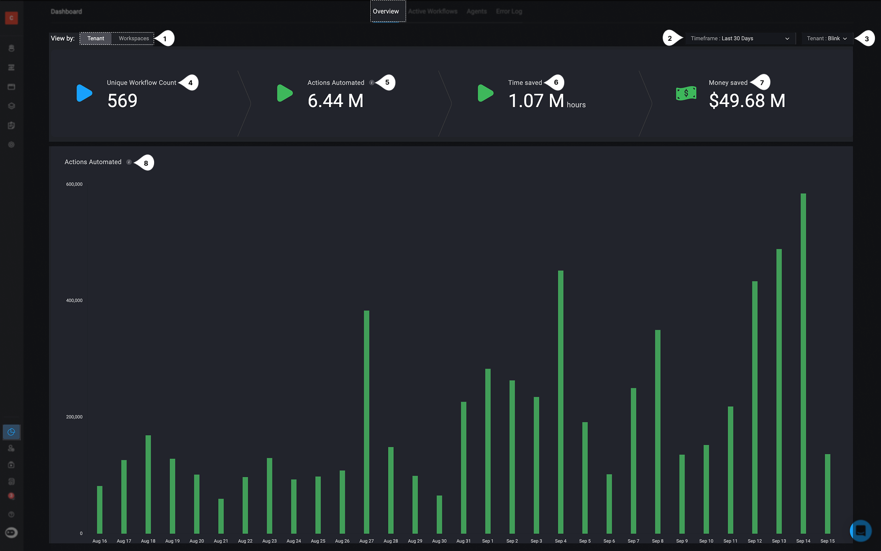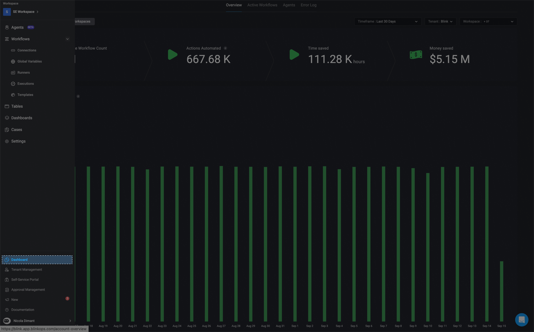The ‘Overview’ provides a centralized view of automation activity across your Blink workspace. It highlights key metrics such as workflow usage, actions automated, time saved, and estimated cost savings, helping teams monitor performance, track impact, and optimize automation at scale. Filters by tenant, workspace, and timeframe allow you to customize the data view to fit your operational needs.1