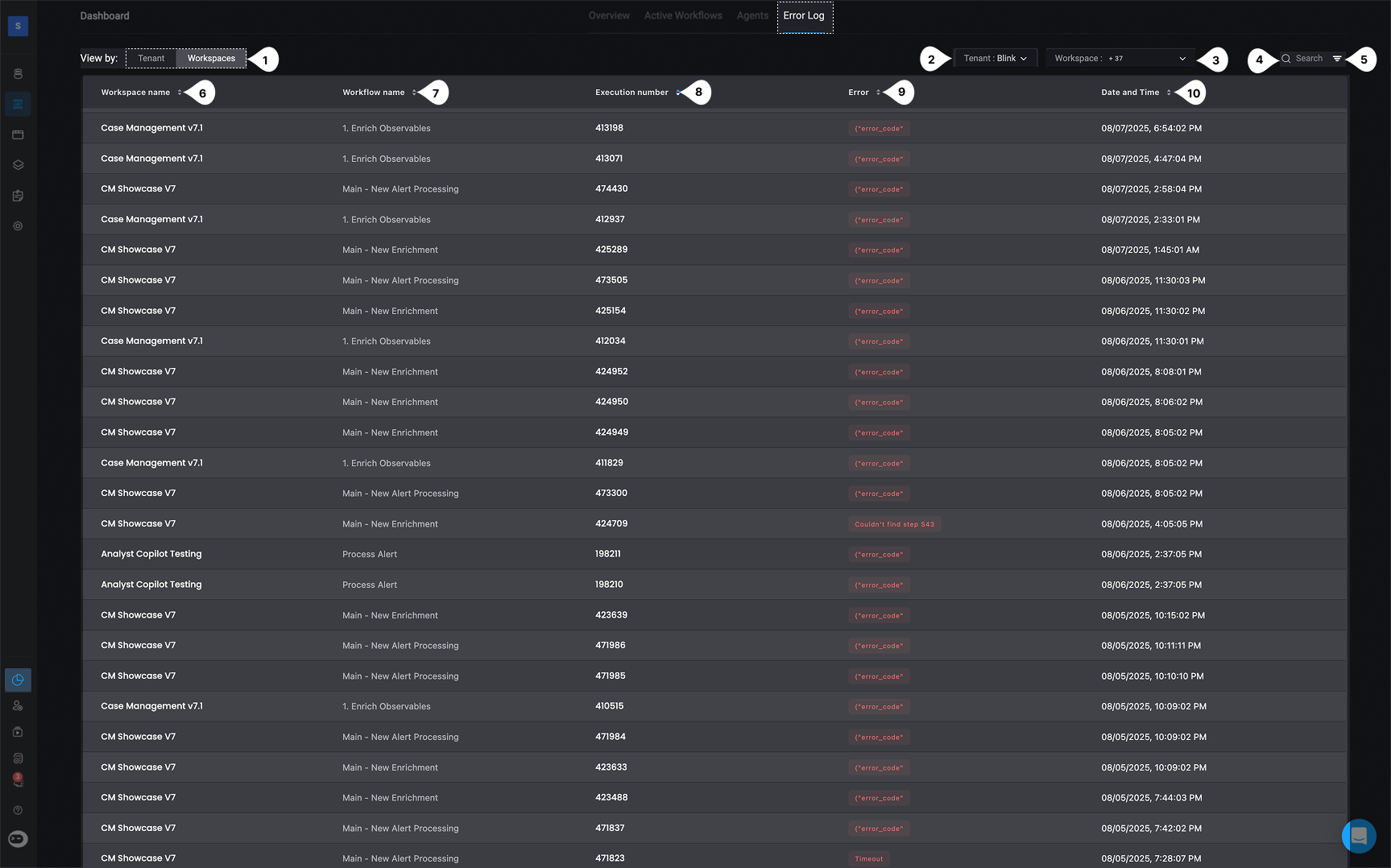 3 | Workspace | Dropdown to filter error logs by one or more workspaces within the selected tenant. |