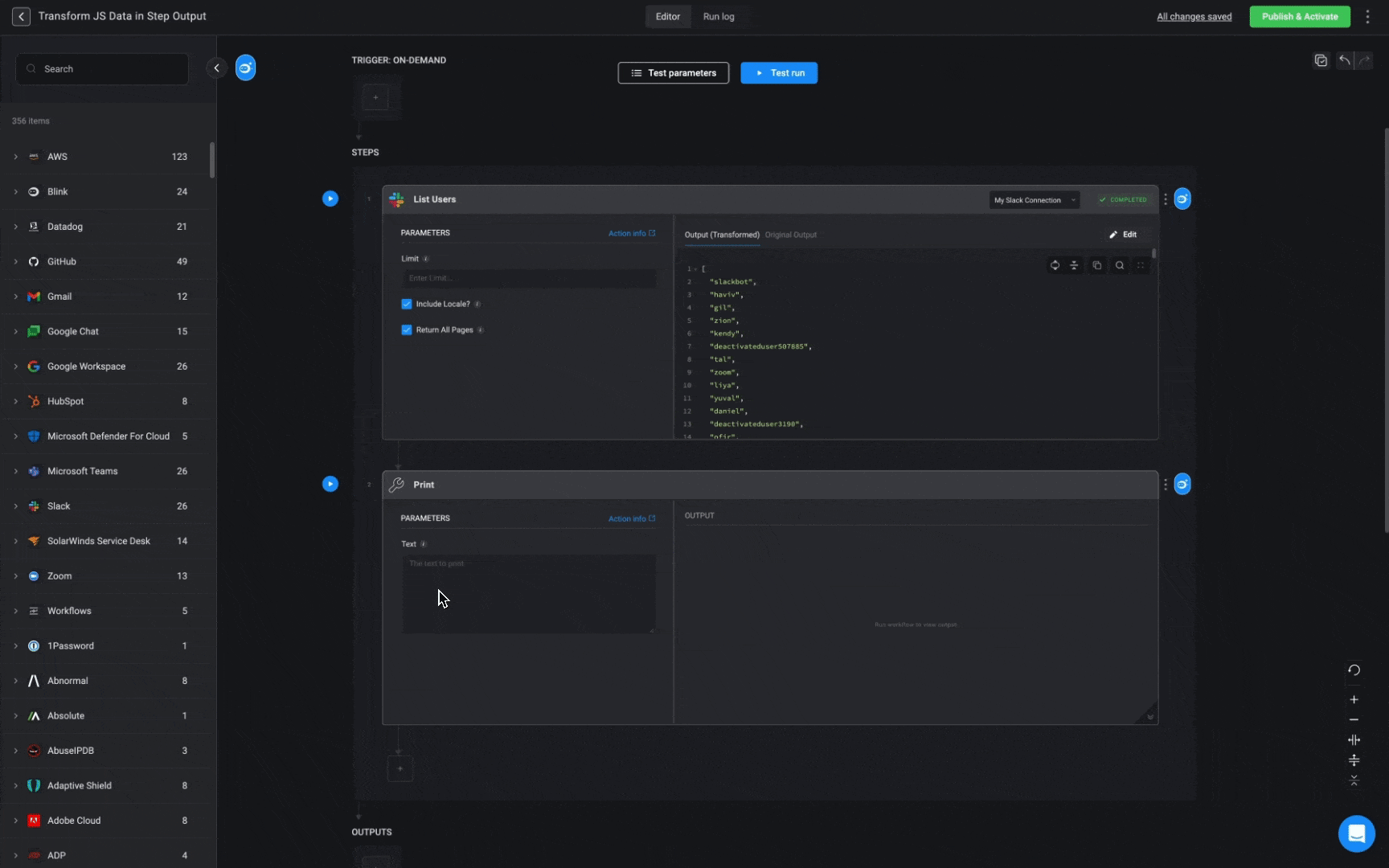 - It will also immediately run the generated script with the sample input data and show the in the “transformed output” section. To apply the transformed output to your Workflow, click the “Apply” button.