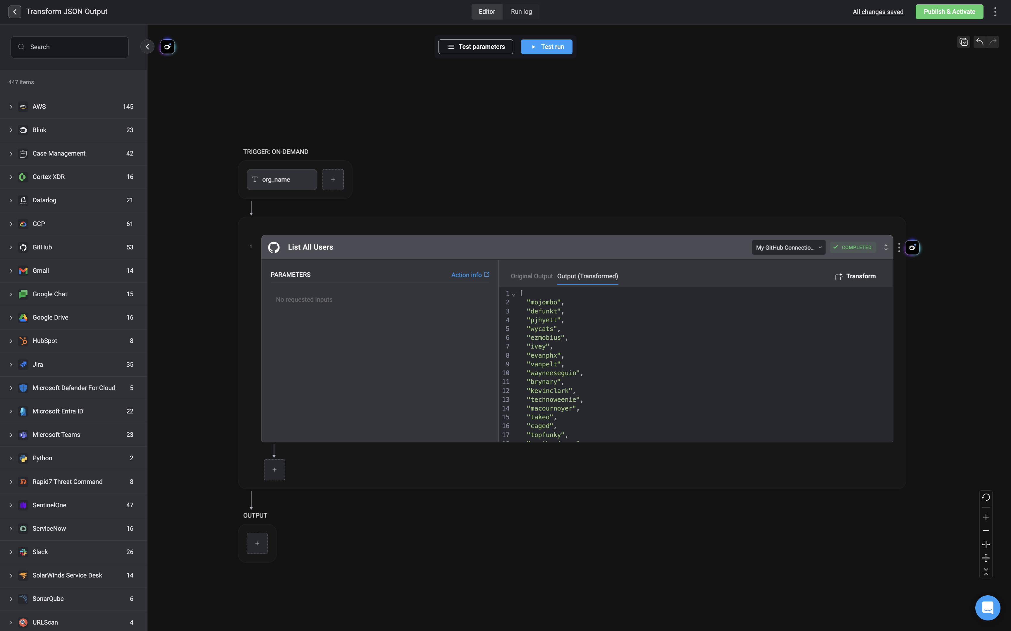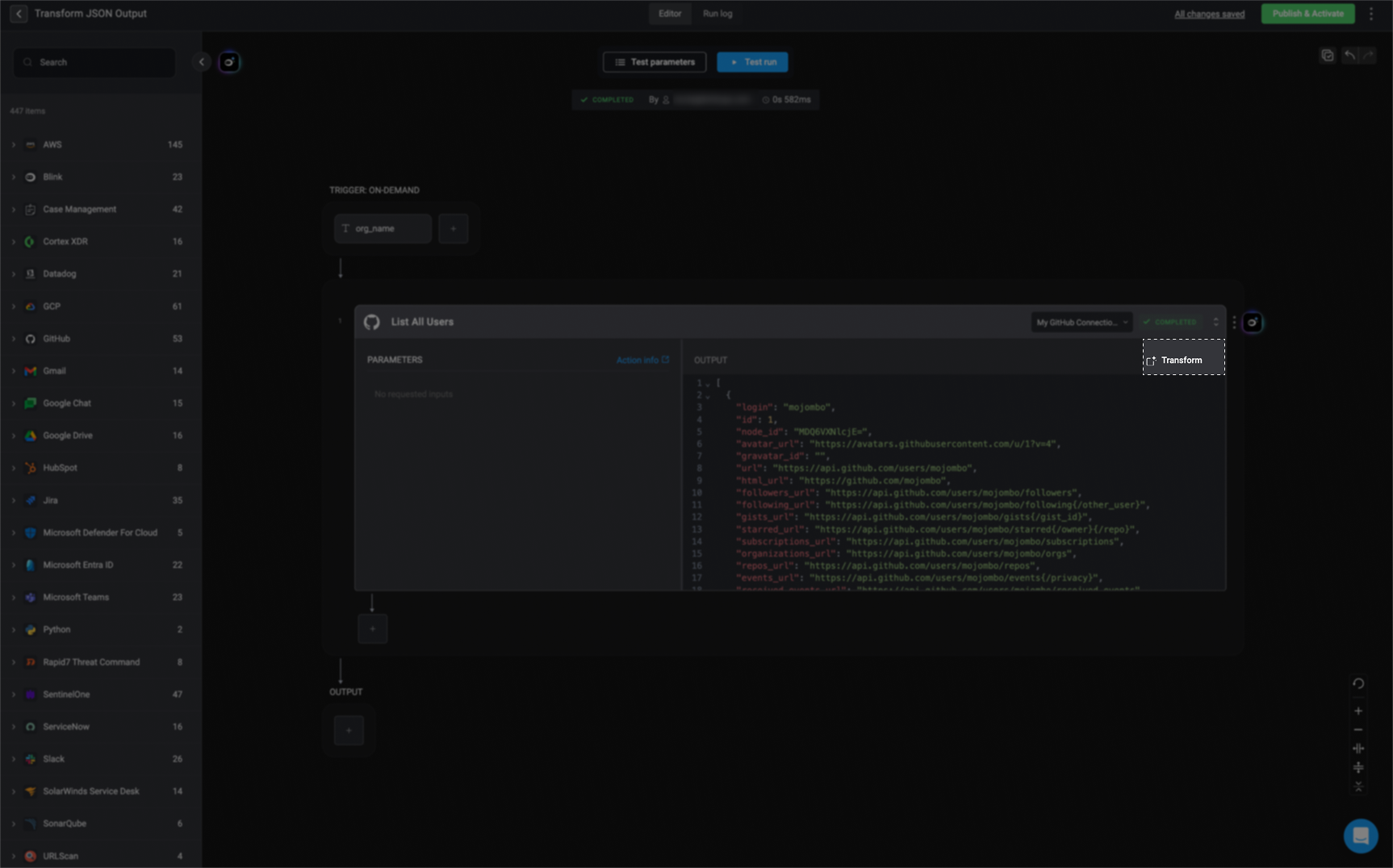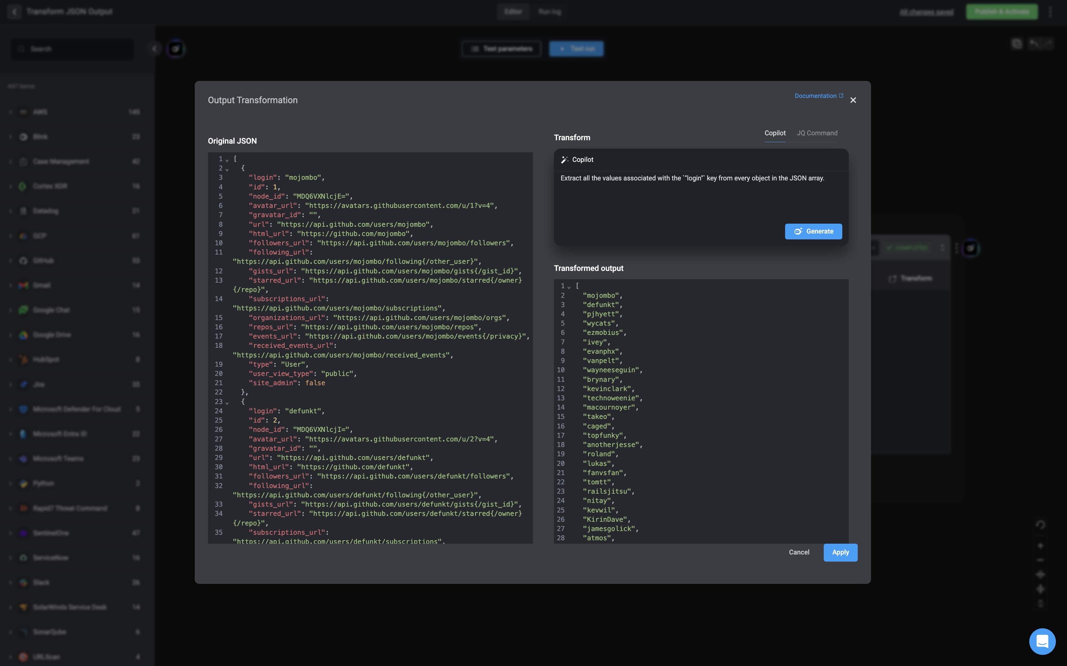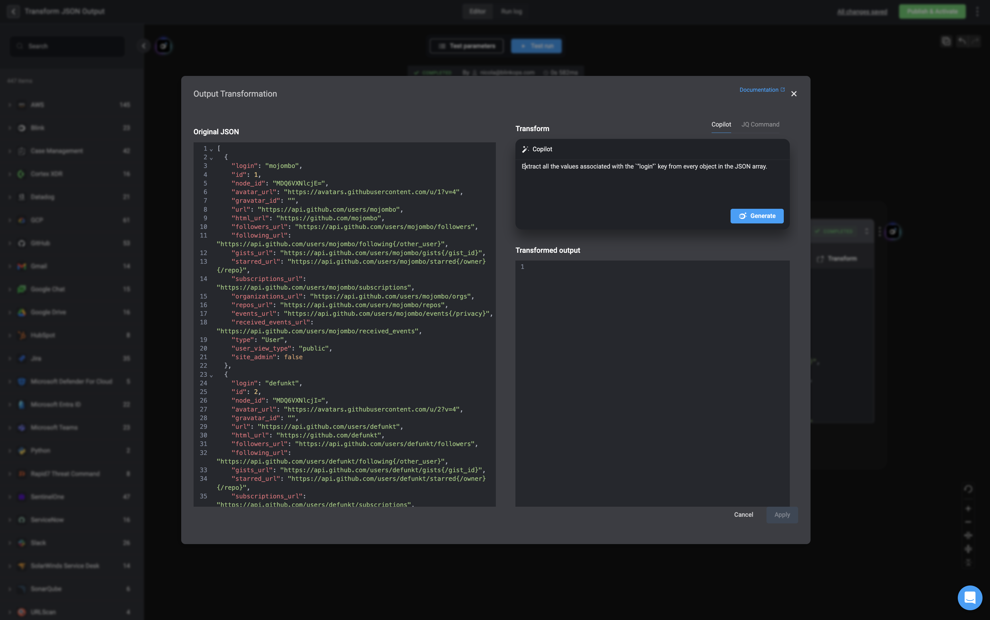 It will also immediately run the generated script with the sample input data and show the in the “transformed output” section. To apply the transformed output to your Workflow, click the “Apply” button.