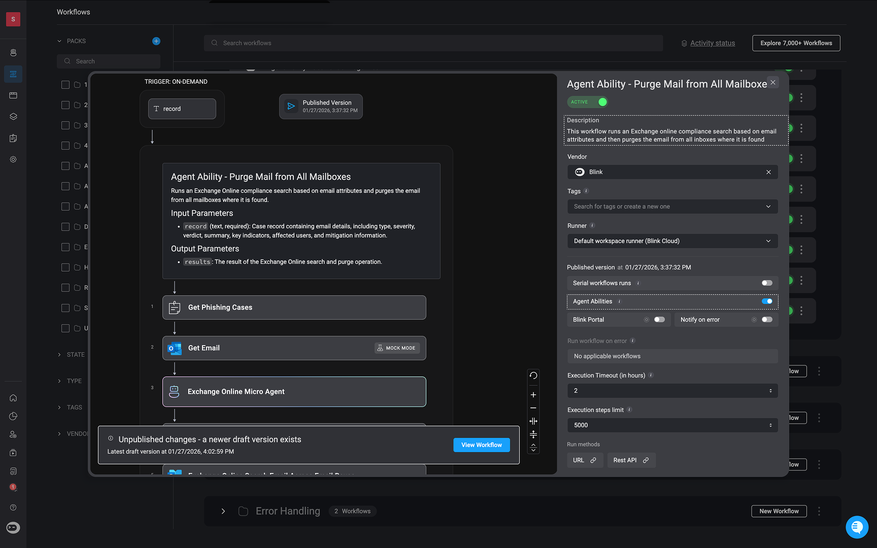Ability workflows are on-demand workflows that helps Agent Blink with additional data and tools for a more detailed analysis and investigation. In any on-demand workflows, you can configure it to be an ability workflow for Agent Blink by toggling the ‘Agent Abilities’ button in the workflow’s settings or on the Workflow Overview page. Once enabled, the workflow is added to the chat interface as an ability workflow. This setting gives the Agent Blink access to the workflow’s configuration and outputs, supporting deeper analysis, informed decision-making, and guided response. With visibility into the workflow’s structure and data, the Copilot can more effectively assist analysts throughout the investigation process.
