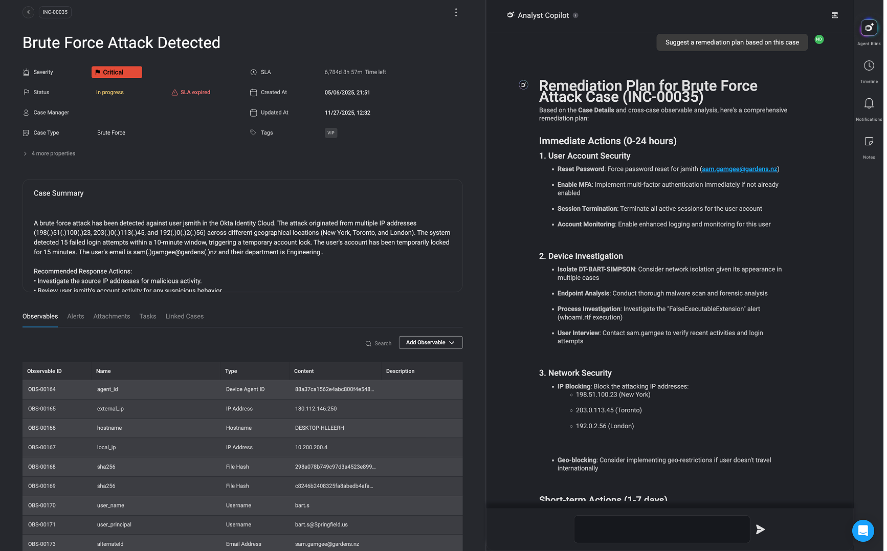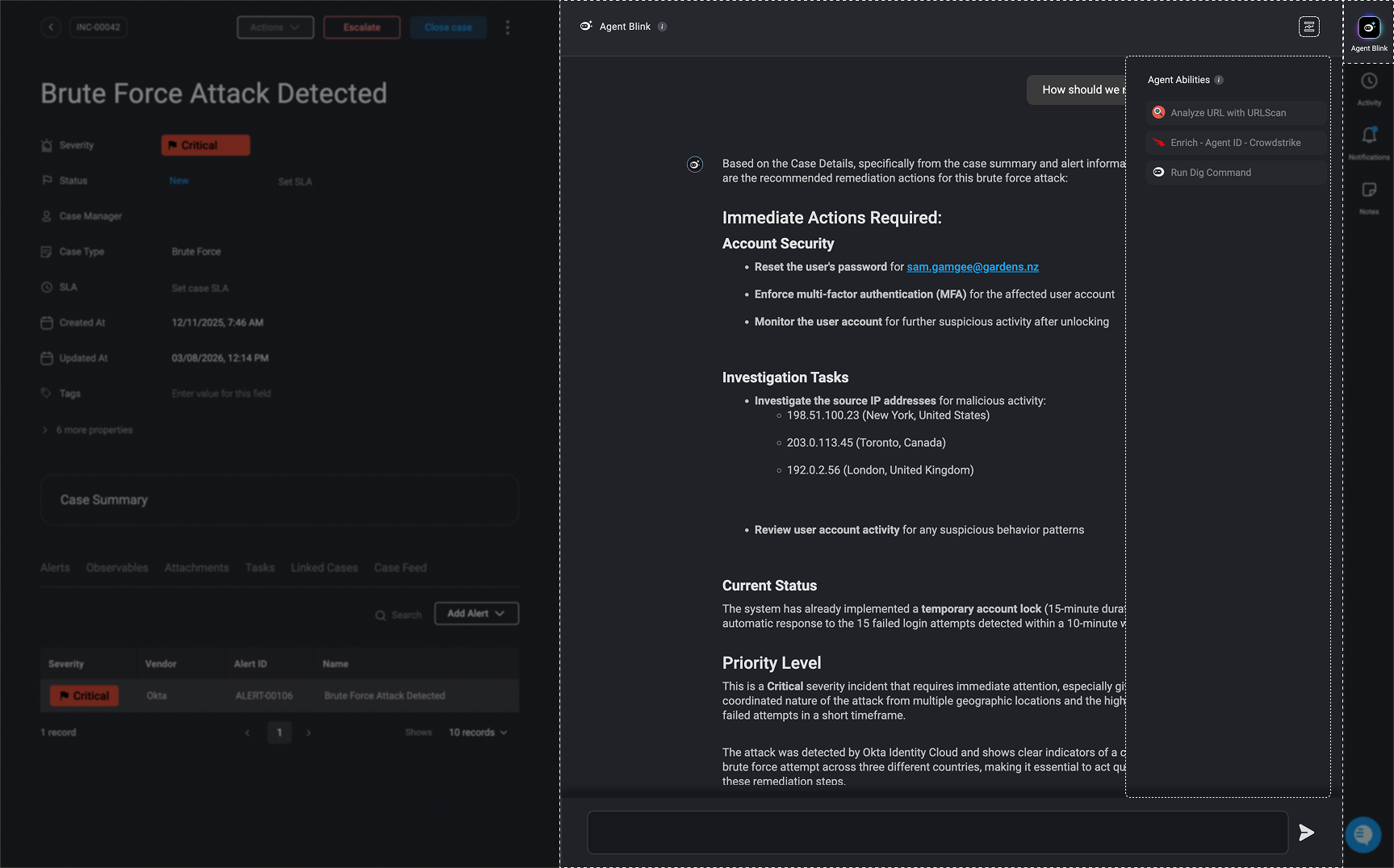 In this use case, the Agent Blink assists in responding to a brute force attack involving suspicious login attempts. The copilot helps the analyst review response actions linked to the case, trigger relevant workflows (e.g., DNS lookups), and suggest a detailed remediation plan, all from within the same interface and using natural language commands.Key Capabilities Demonstrated