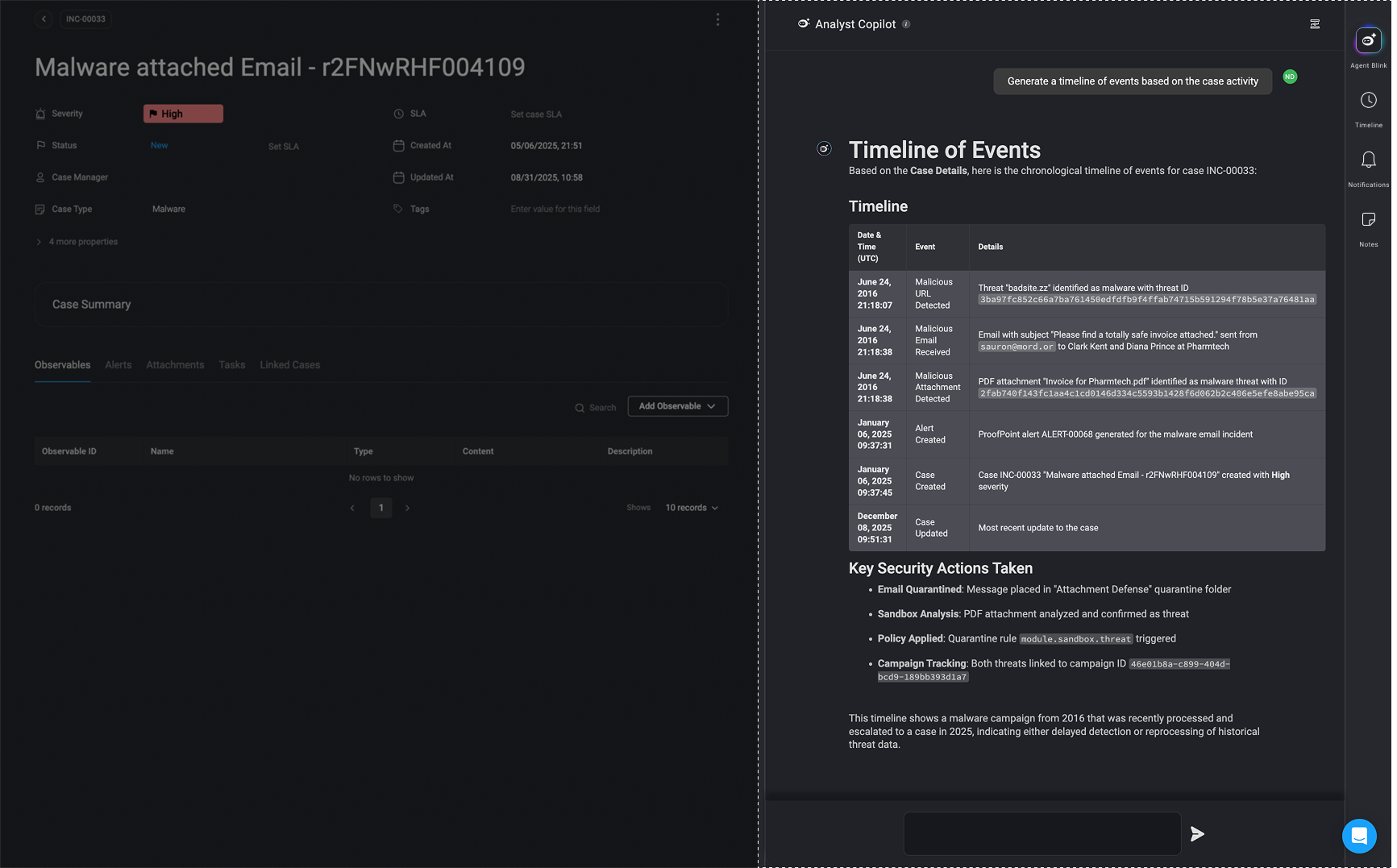 Agent Blink assists security analysts by automatically generating insights and structured timelines for cybersecurity incidents. In this case, it processes details related to a malware-attached email and creates a timeline of events based on case activity.Key Capabilities Demonstrated