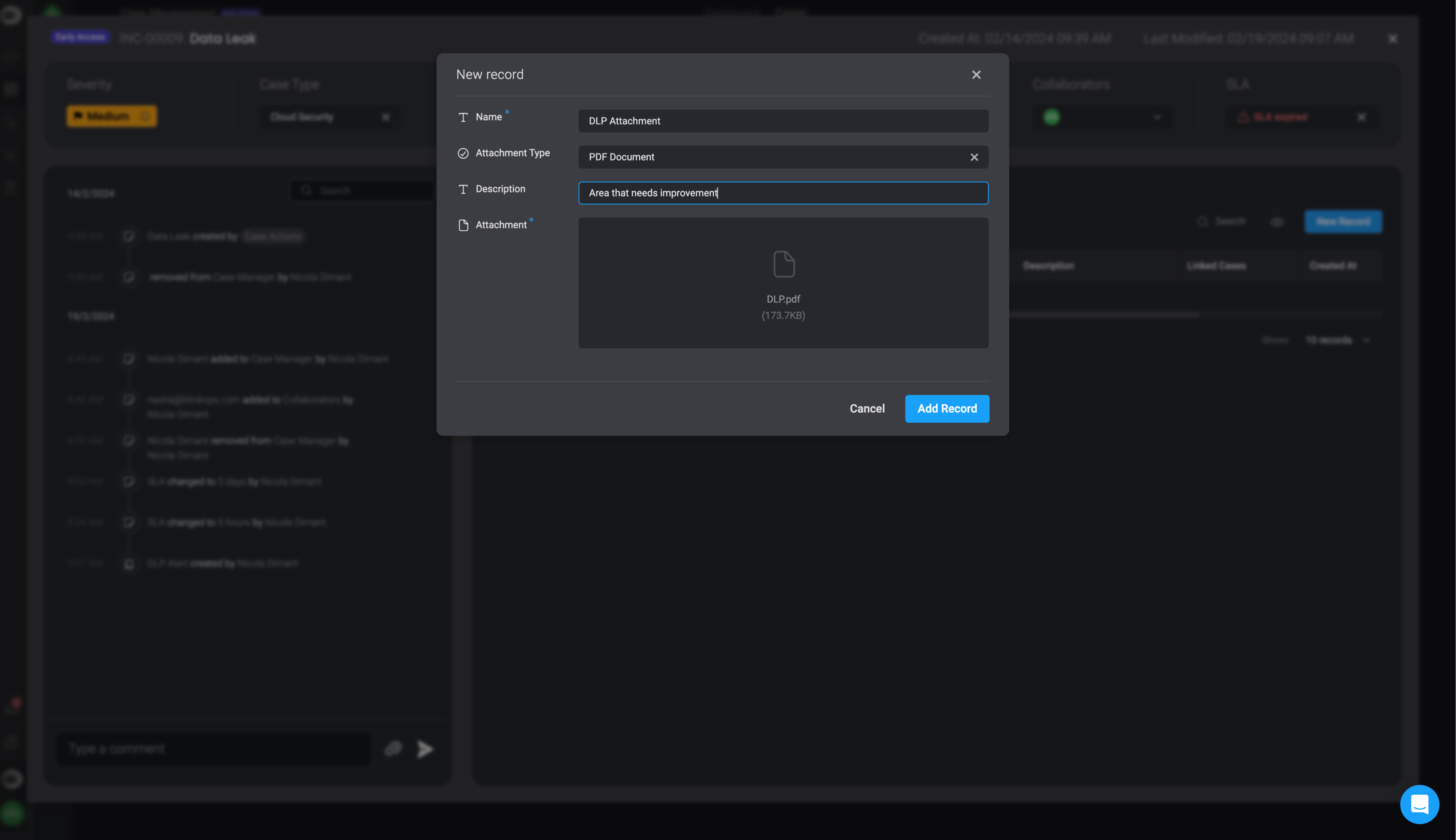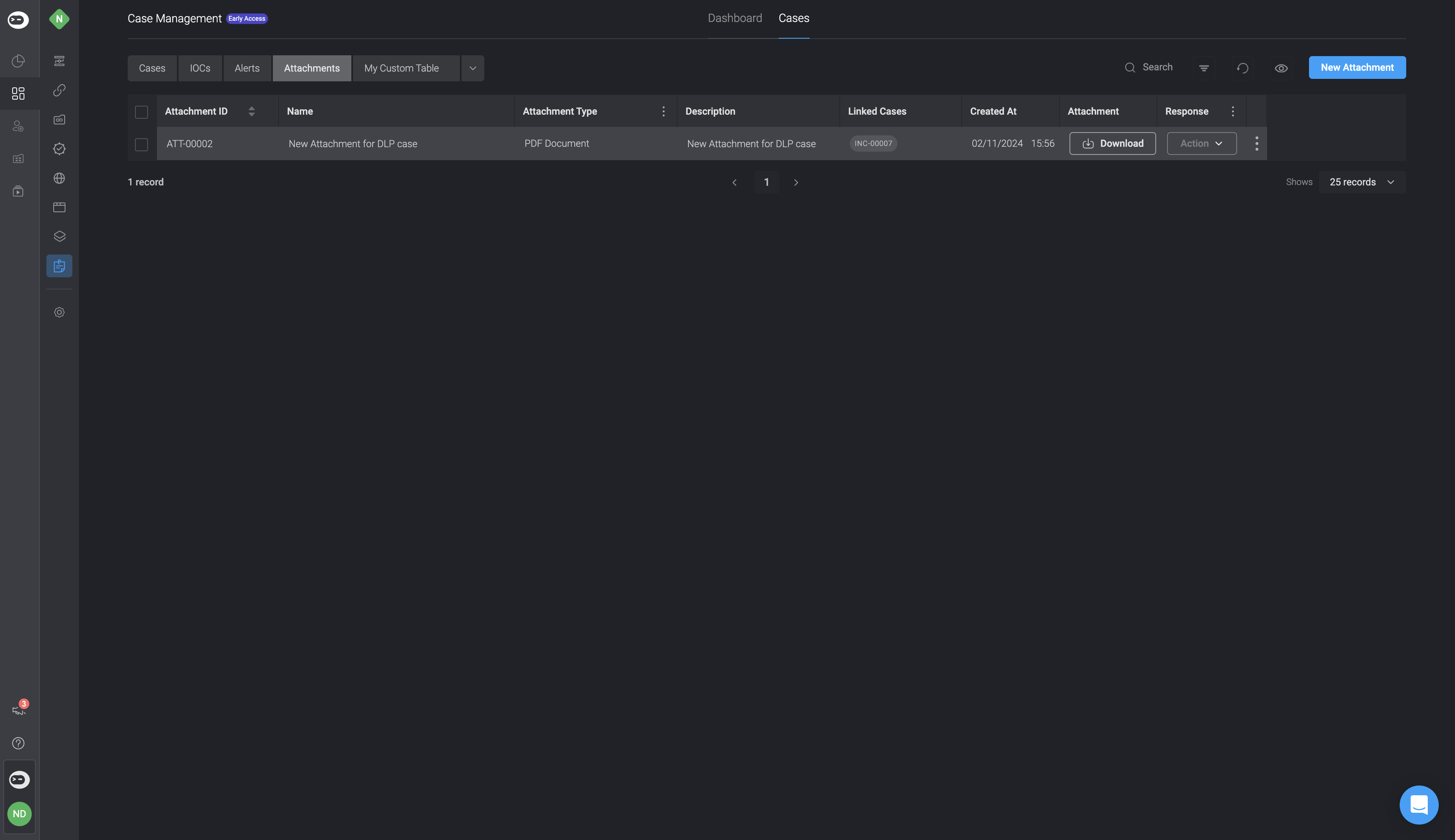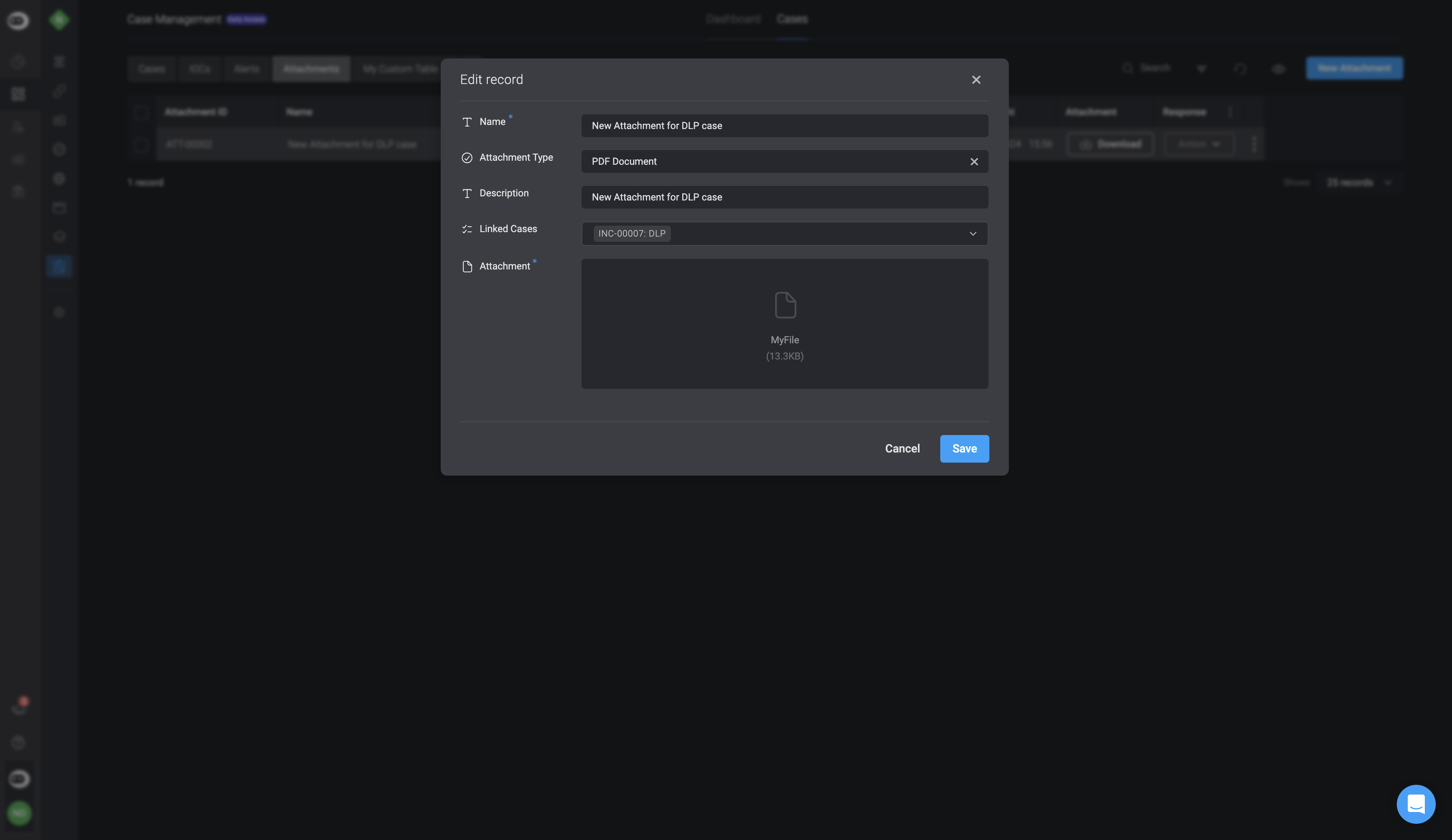 You can add attachments directly from a specific Case or through the main Attachments table. Each attachment can be associated with one or more records to provide context and improve traceability during the investigation process.