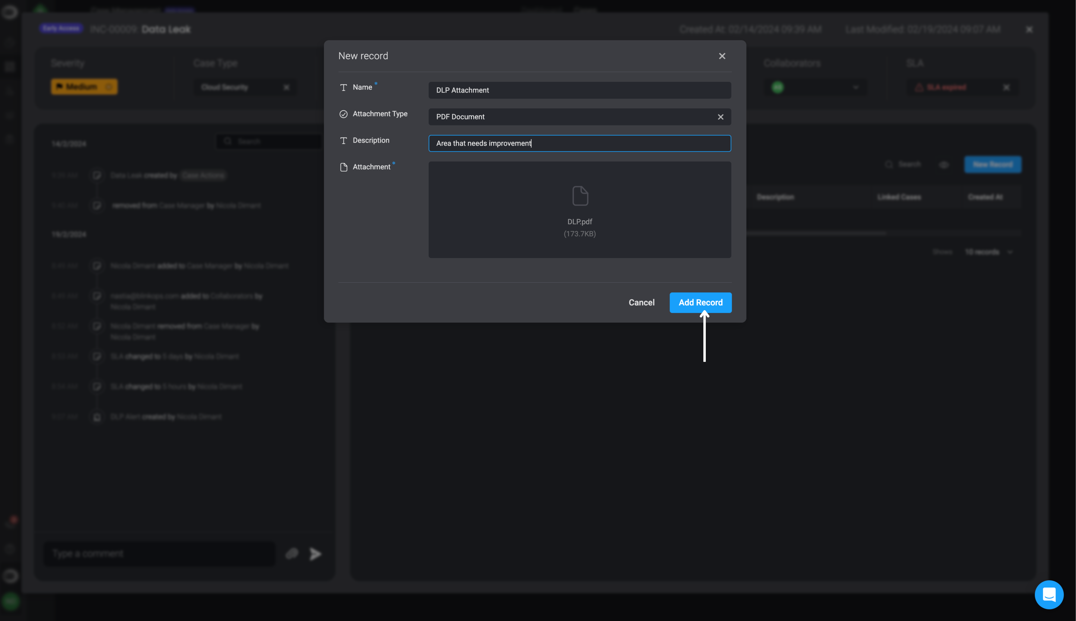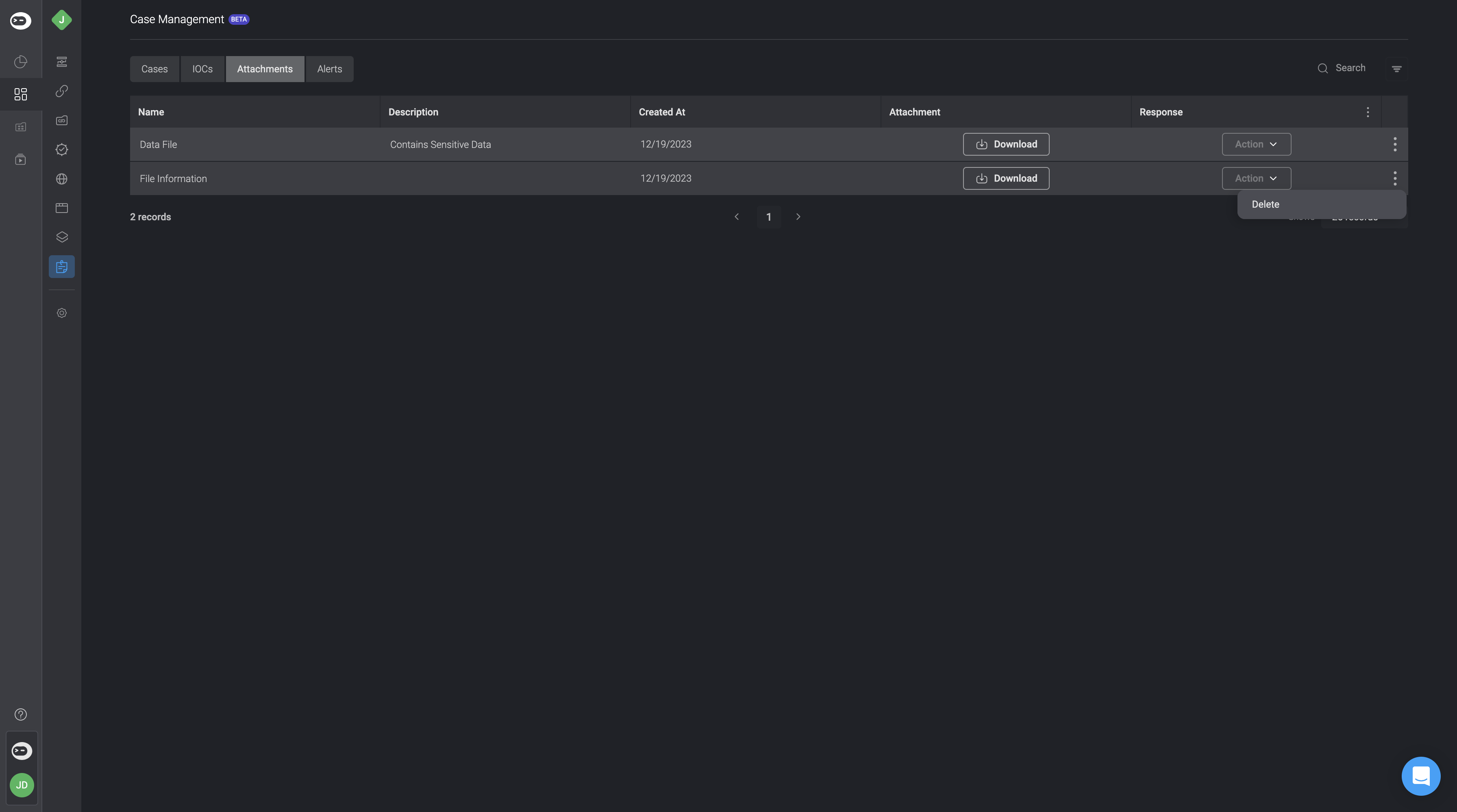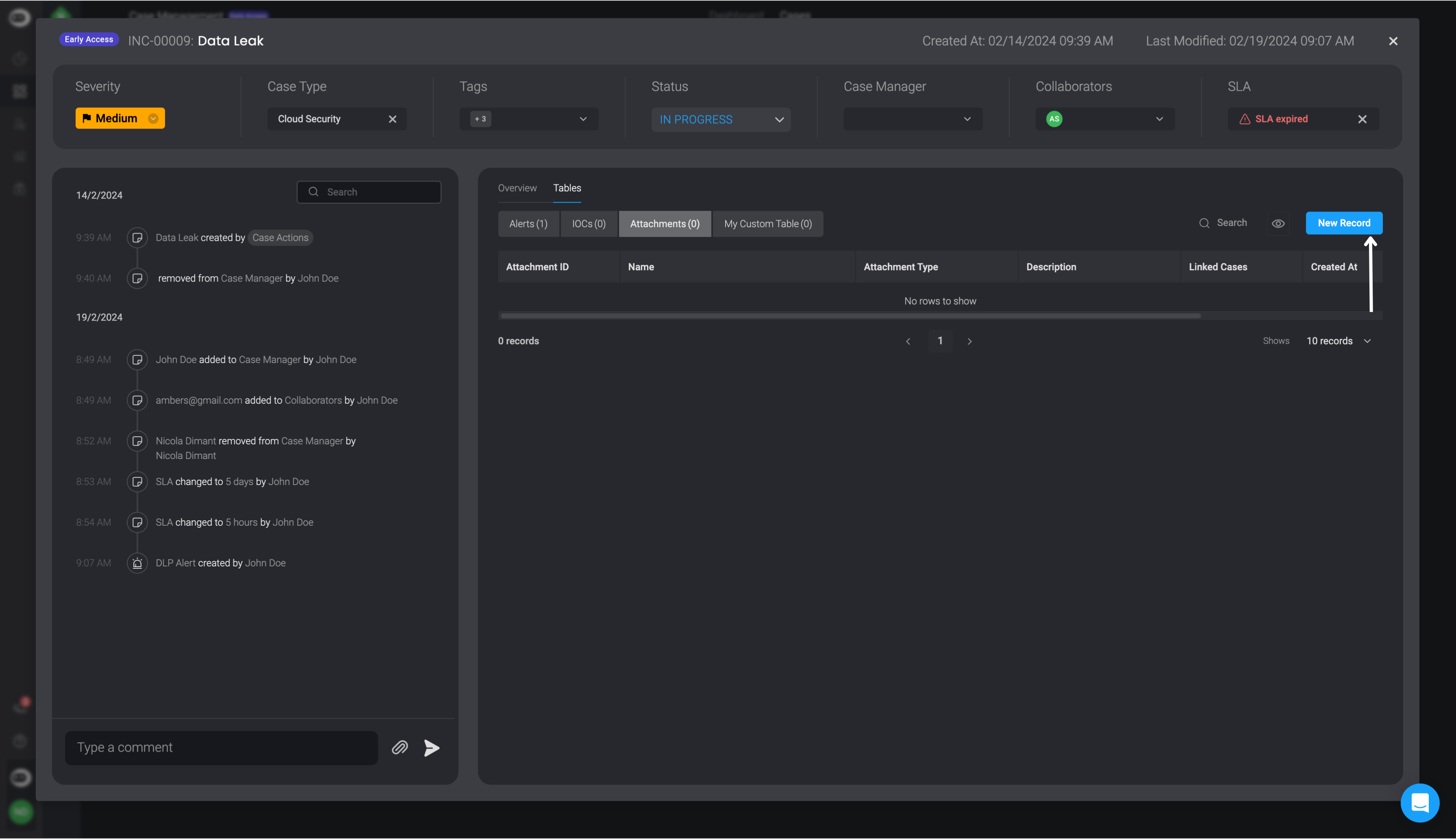 You can add attachments directly from a specific Case or through the main Attachments table. Each attachment can be associated with one or more records to provide context and improve traceability during the investigation process.