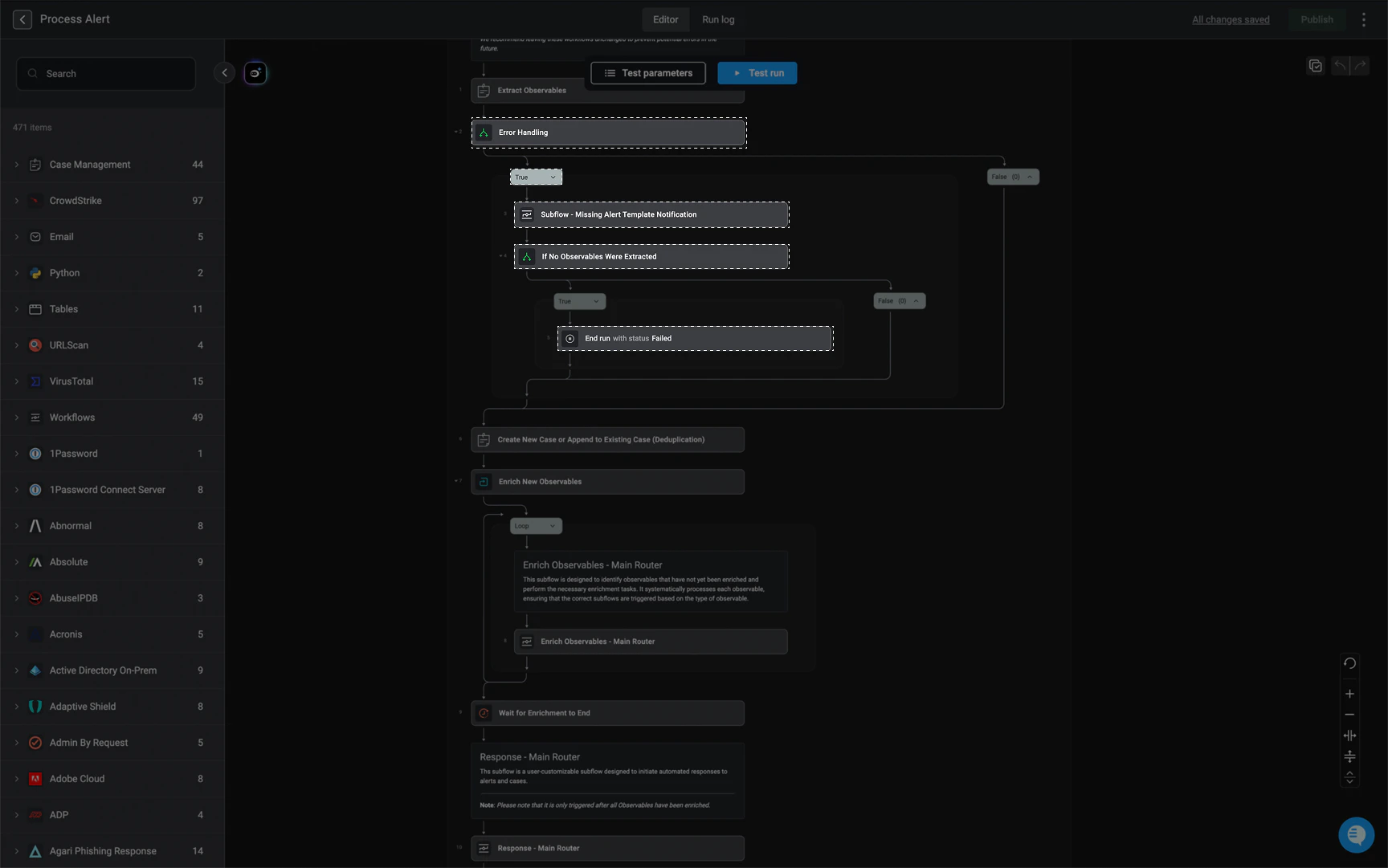 Ths subflow is a user-customizable workflow designed to initiate automated responses to alerts and cases.Note: This subflow is only triggered after all Observables have been enriched.