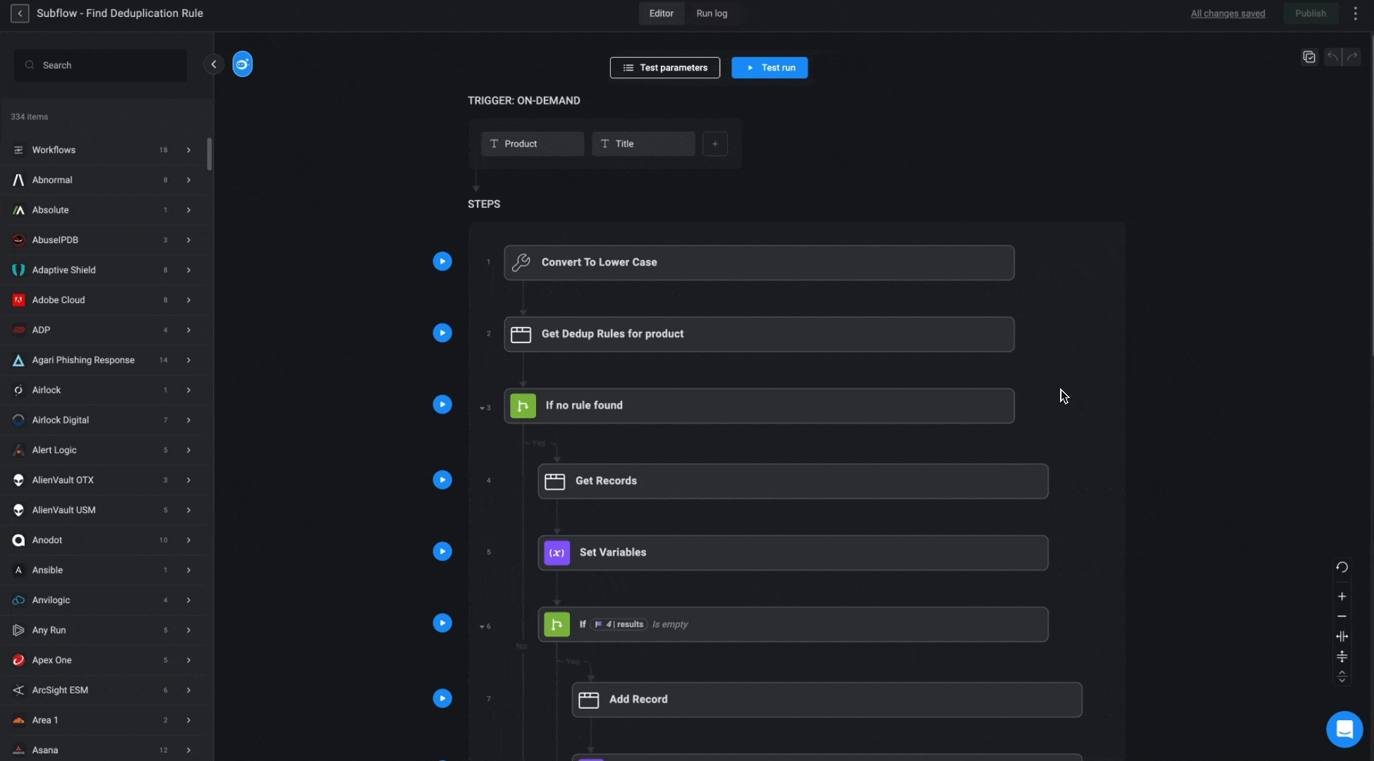 This Subflow determines the most suitable deduplication rule for a given alert, following a hierarchy of priority. It first checks for a specific rule associated with the alert. If no specific rule is found, it attempts to retrieve a universal rule for the vendor. If no universal rule exists, one will be created using “Name” as the default deduplication parameter.