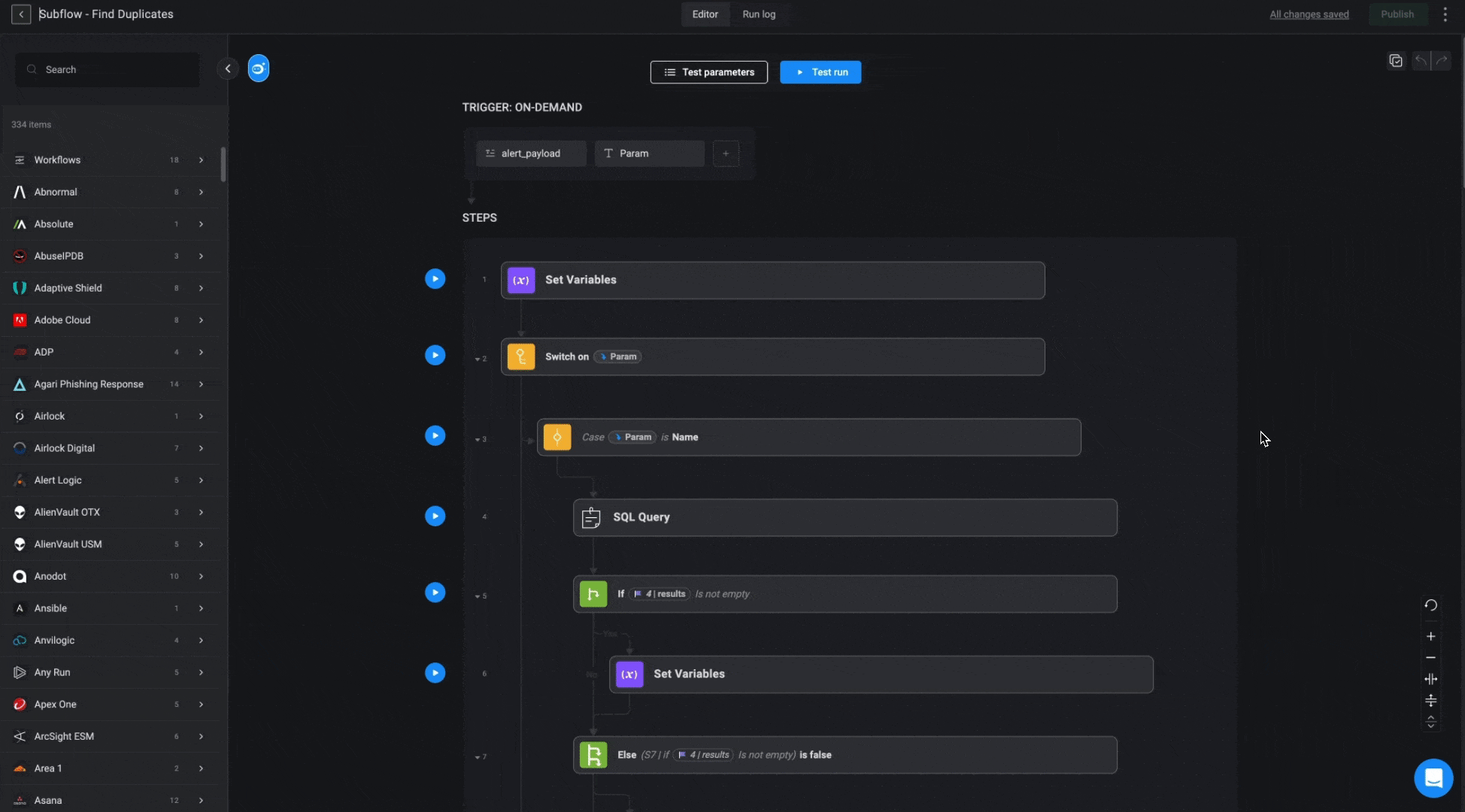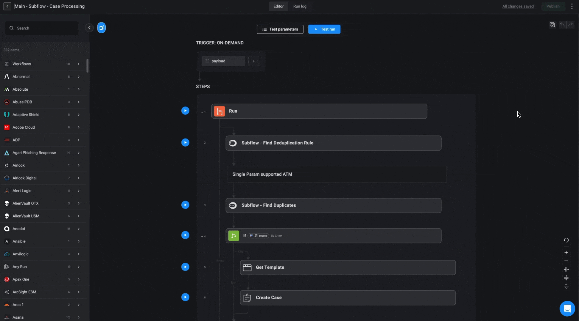This subflow identifies if the alert has any duplicates in any open case or in a case closed within the last 7 days. If duplicates are found, it provides the case ID, flags whether the case should be reopened, and if no duplicate exists.- If multiple observables are valid for deduplication (e.g., the deduplication parameter is “User” and multiple users are linked), the first case found will be used. If there are multiple cases, the most recently updated one will be selected.