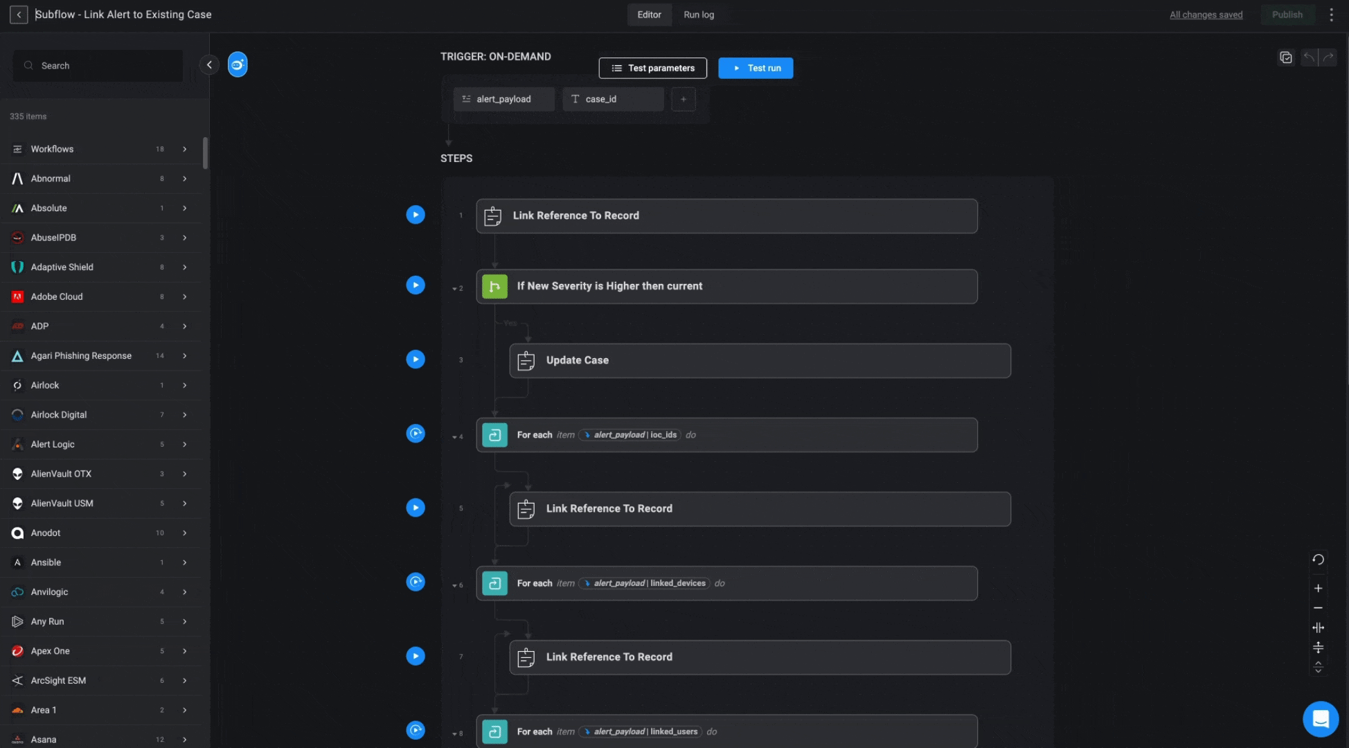This subflow links the alert, along with its associated observables, to the identified case. It also updates the case severity to match the alert’s severity if the alert’s severity is higher.