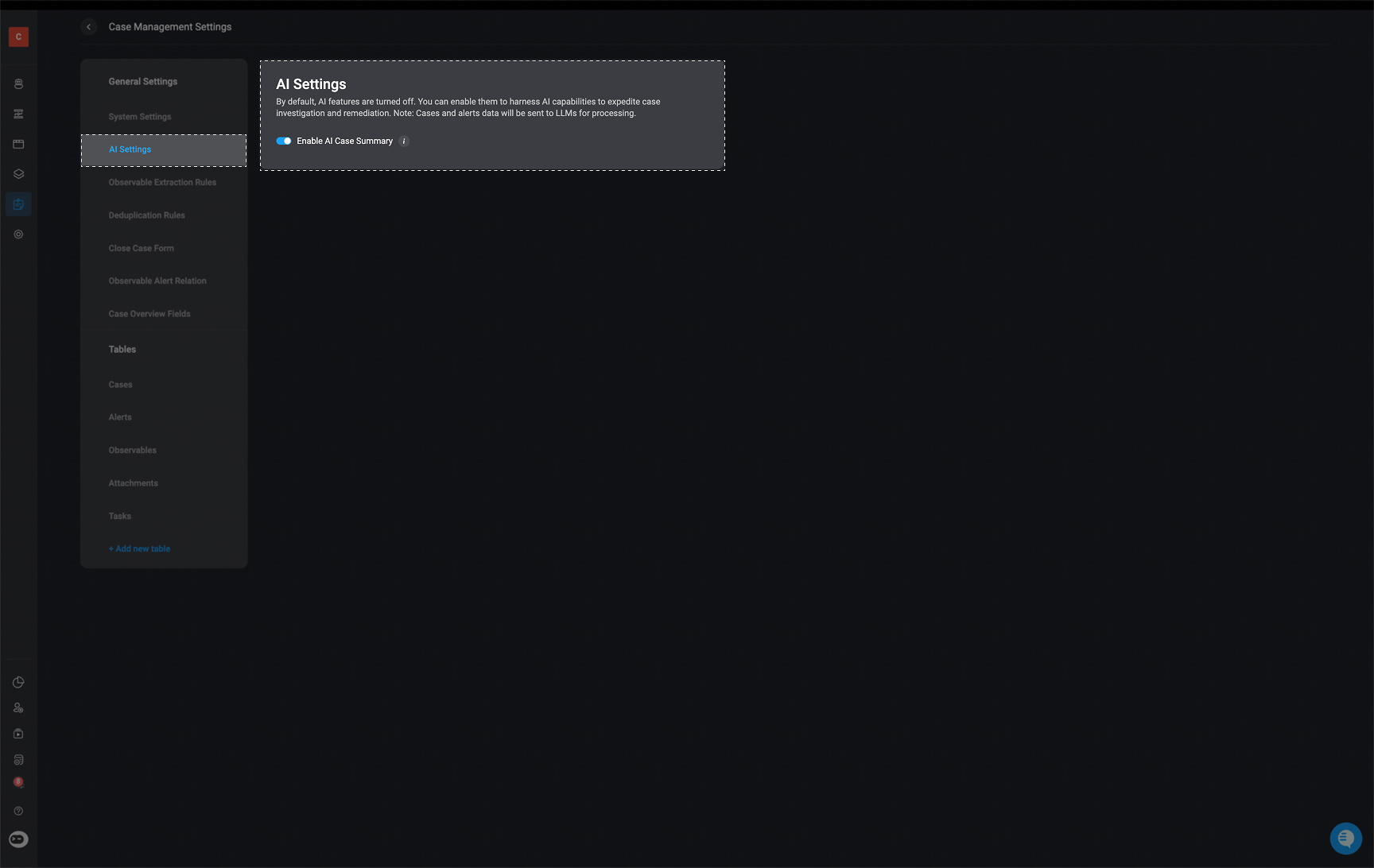 By default, AI features are turned off. You can enable them to harness AI capabilities to expedite case investigation and remediation. Note: Cases and alerts data will be sent to LLMs for processing.When toggling the Enable AI Case Summary button, you can generate an AI summary on demand. The summary will be based on the case timeline events, including alerts and observable data from case creation until the time of generation.