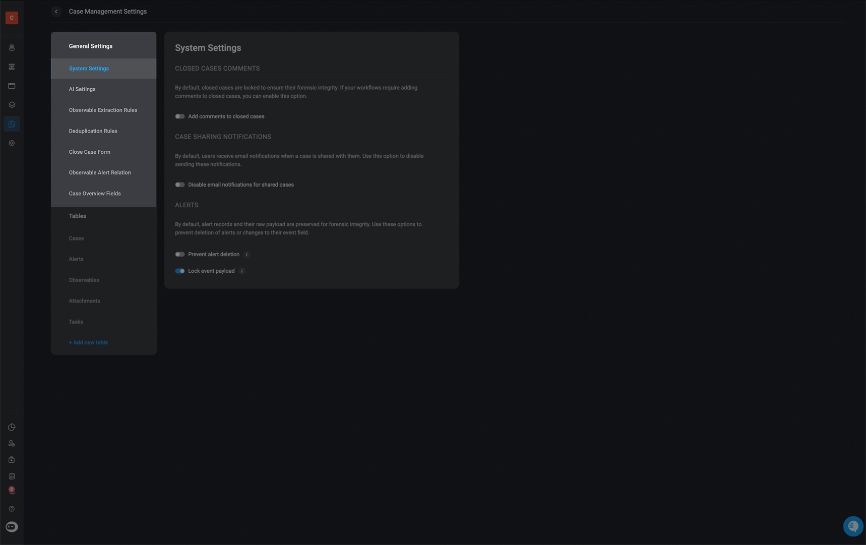 By default, closed cases are locked to ensure their forensic integrity. However, if you would like to add comments to closed cases, toggle the button to enable this setting.
