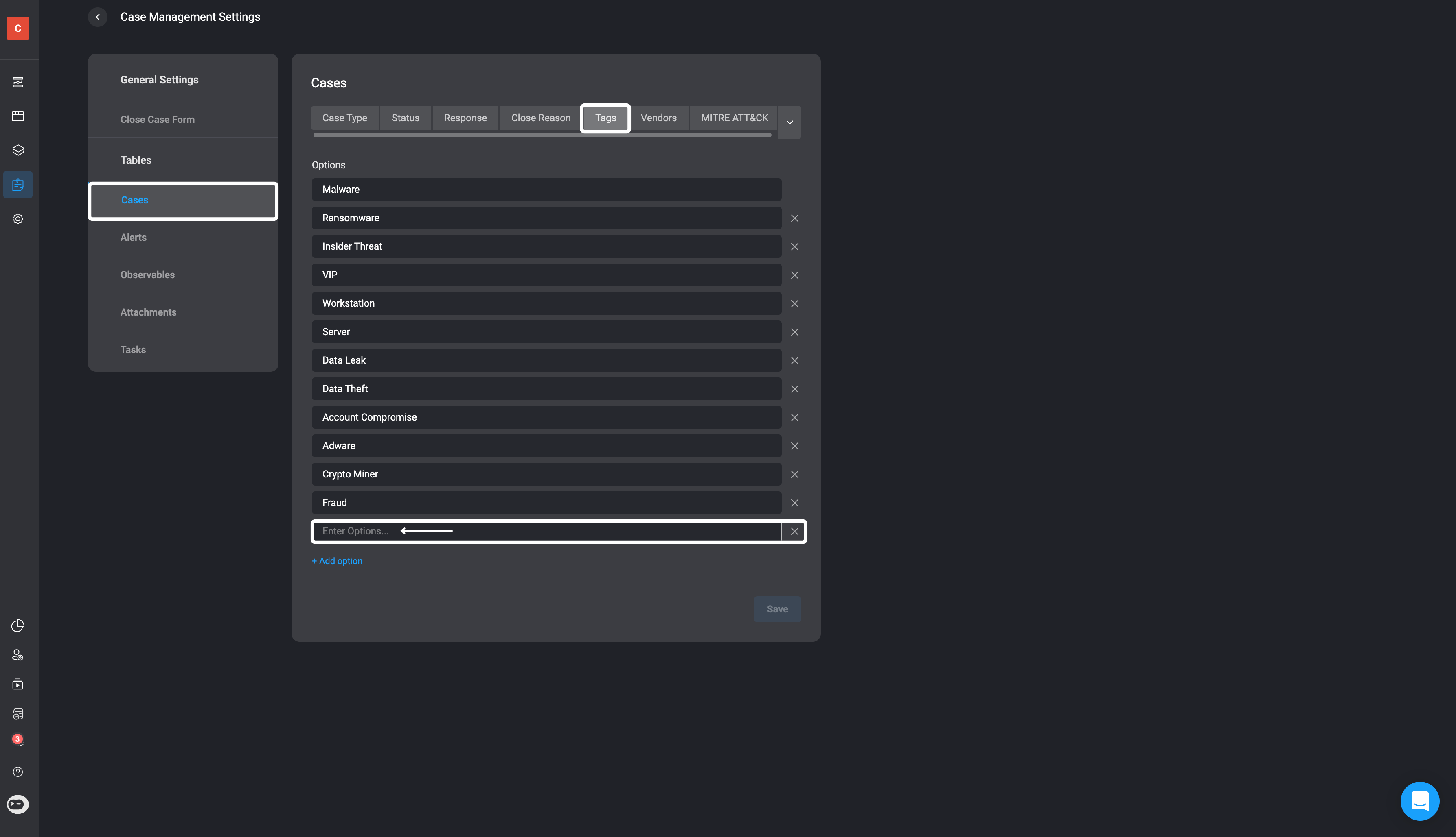 - In the MITRE ATT&CK tab, you can edit the already existing MITRE ATT&CK types, delete or add your own custom MITRE ATT&CK types.