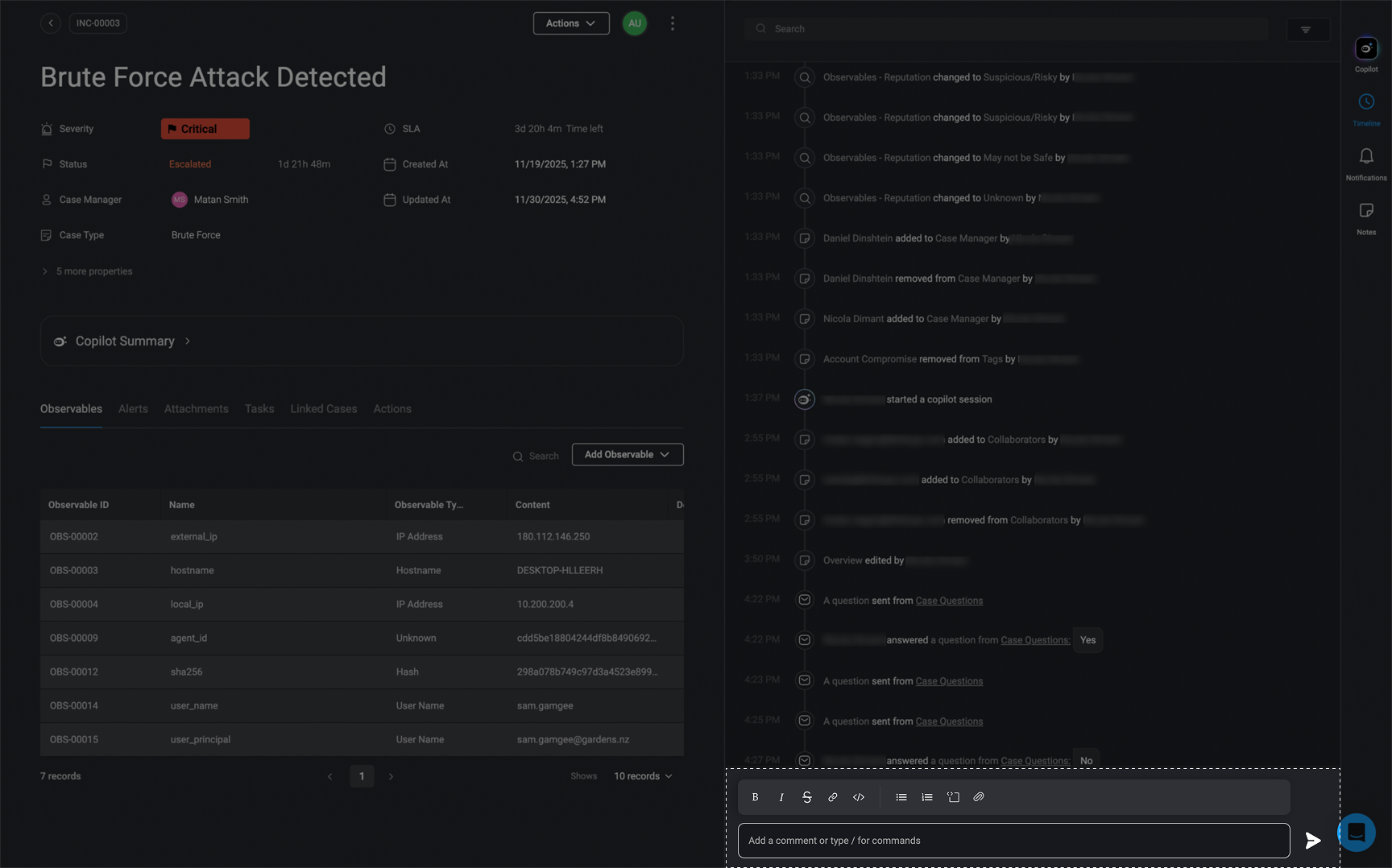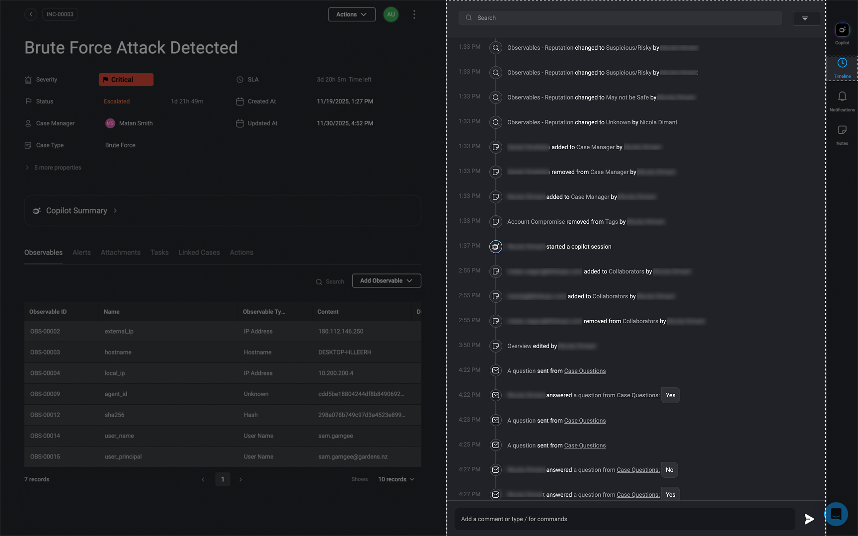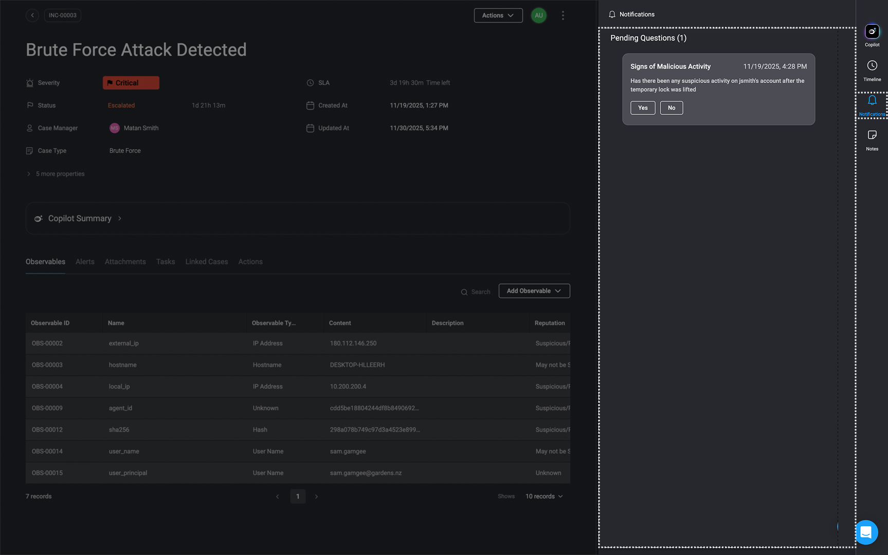 Analysts can respond directly from this view. Each answer is automatically added to the Case Timeline, and once submitted, the related Ask a Question on a Case action resumes, allowing the workflow to continue seamlessly.