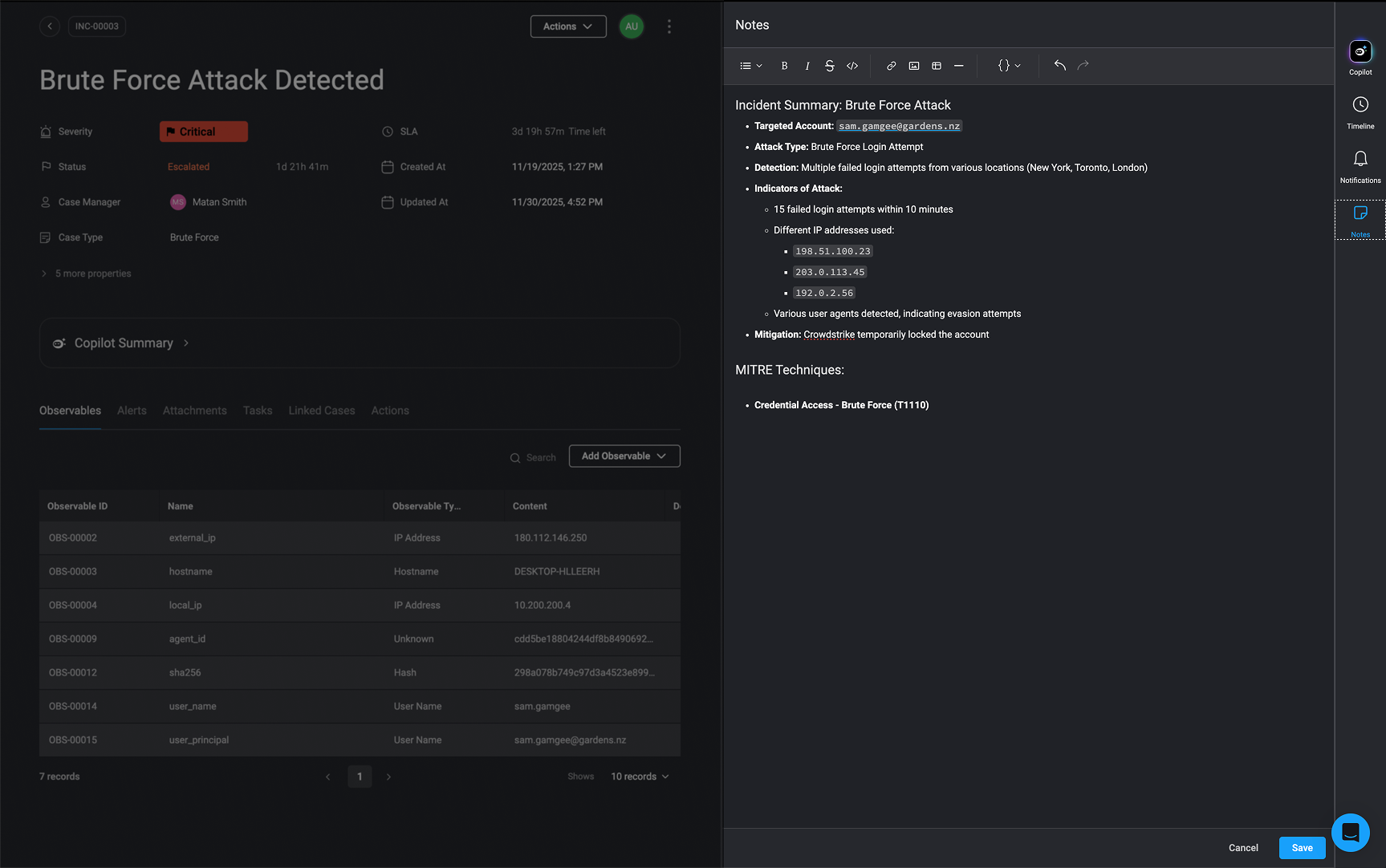 - The “Notes” section should be used to document the incident investigation and to add analyst notes related to the case.
