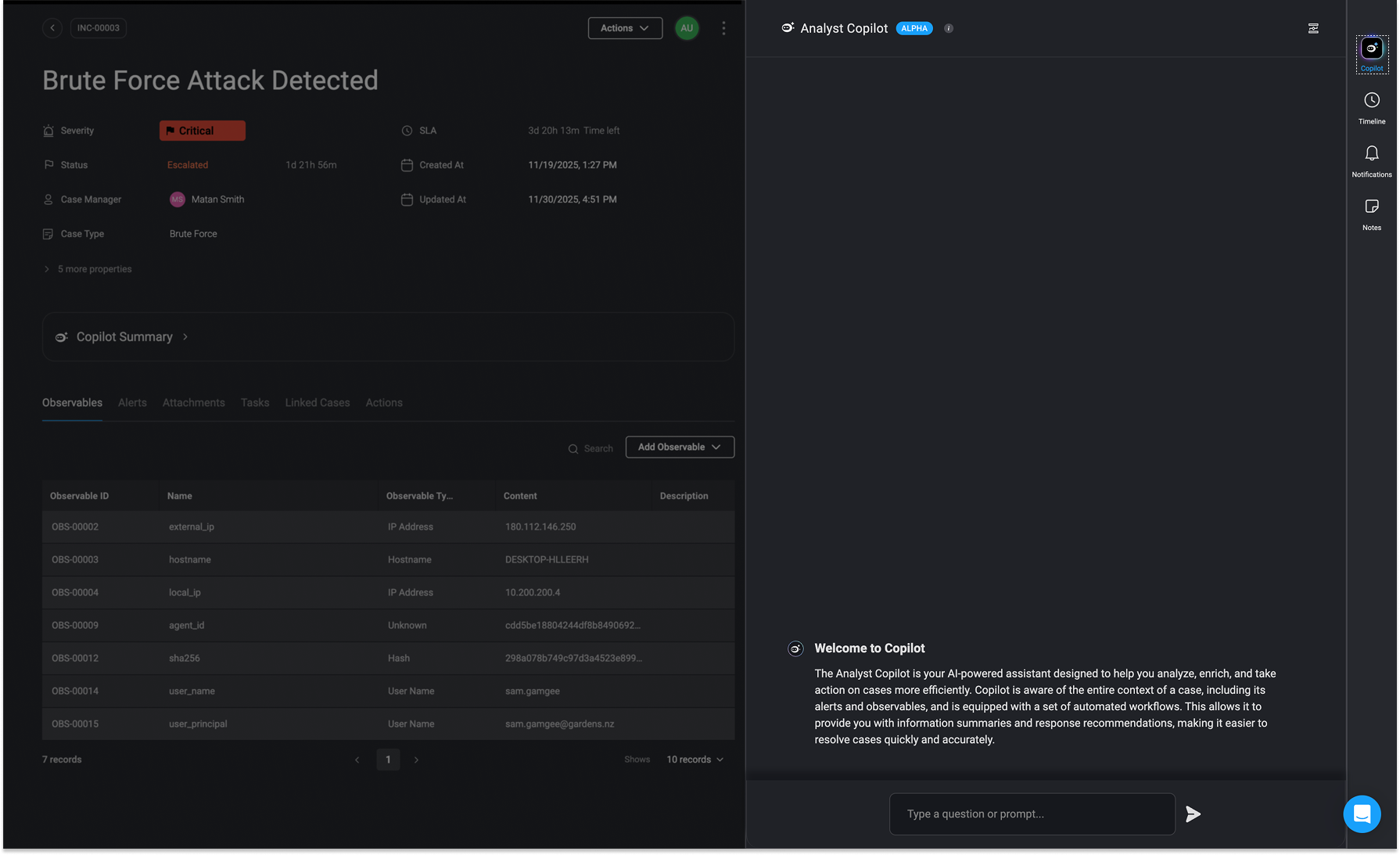 The Analyst Copilot is an AI-powered assistant designed to help SOC analysts streamline incident response, investigation, and remediation. Built on an advanced model, the Analyst Copilot understands the full context of each security incident, providing enriched insights and real-time recommendations. To learn more about the Analyst Copilot, navigate here