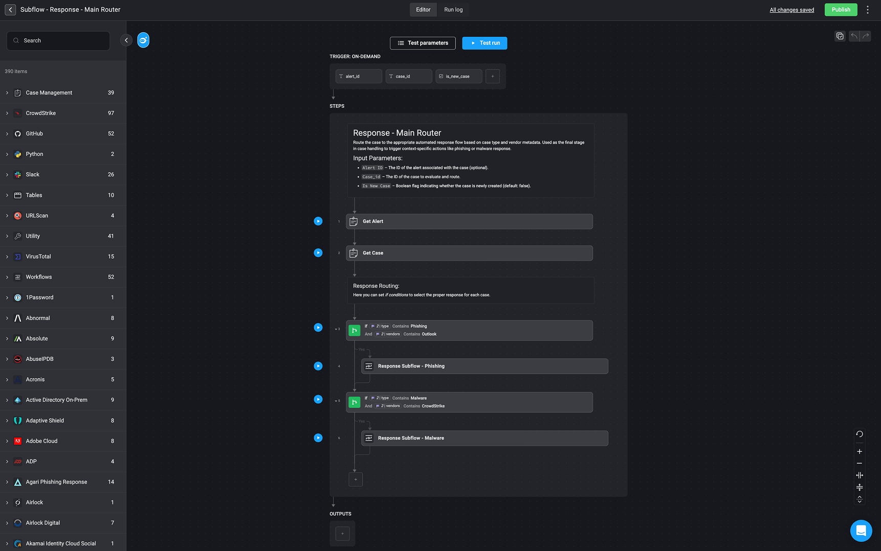 In this example, the subflow starts by looking at information collected and enriched in earlier steps of the workflow. For instance, it examines alert details such as the type of threat (e.g., phishing or malware) and which security tool detected it (e.g., Outlook or CrowdStrike). Based on these details, the subflow follows one of two paths:-