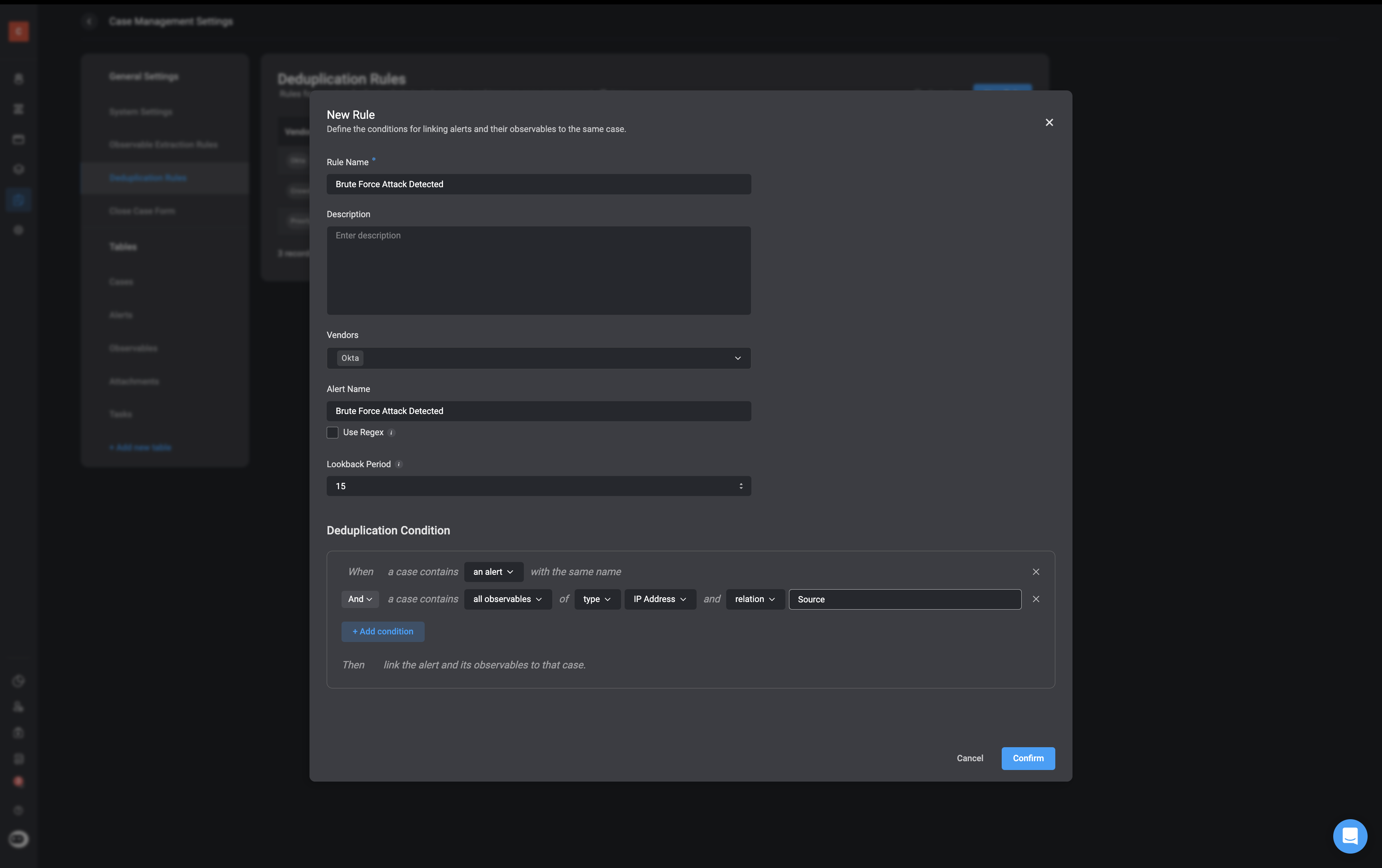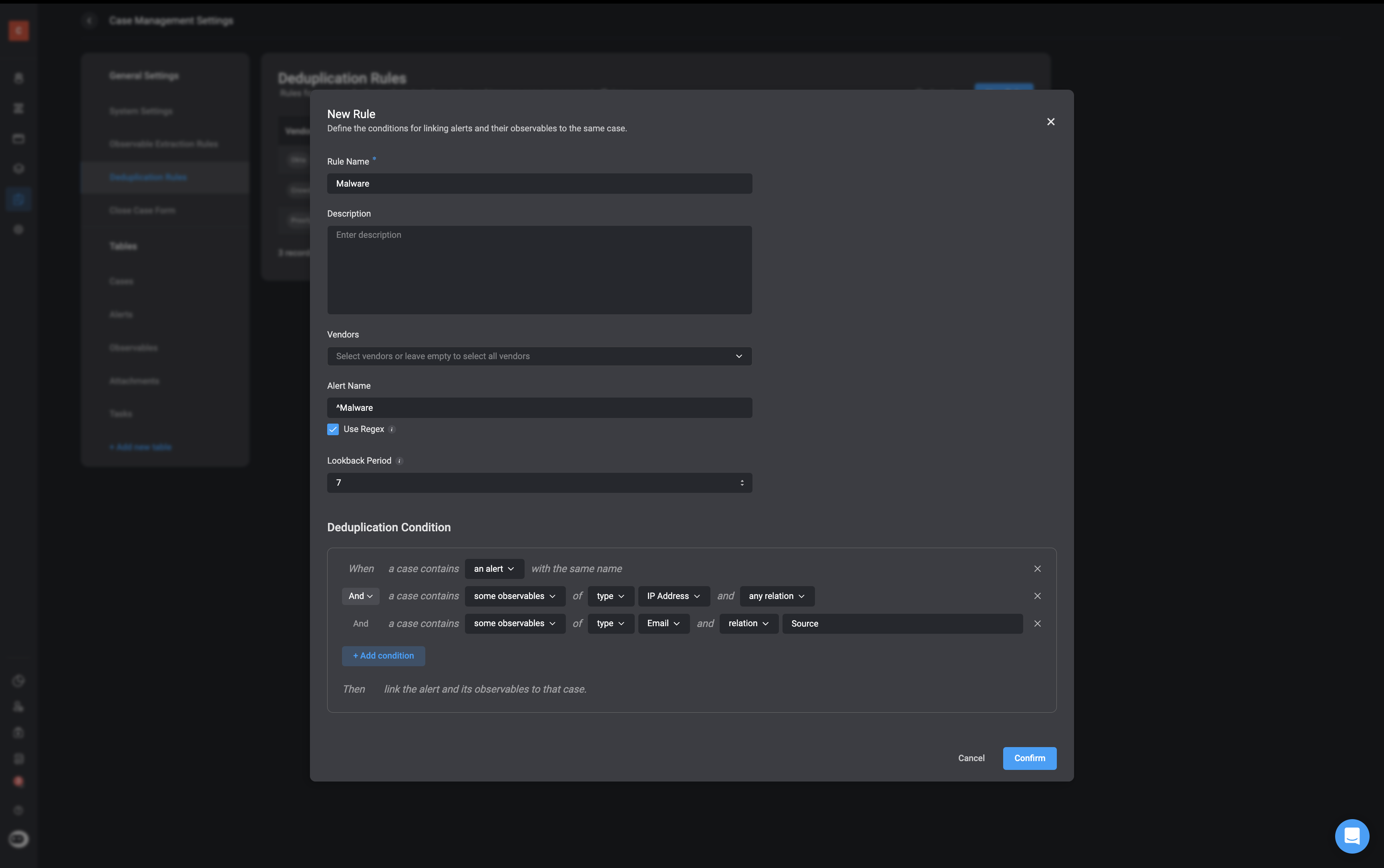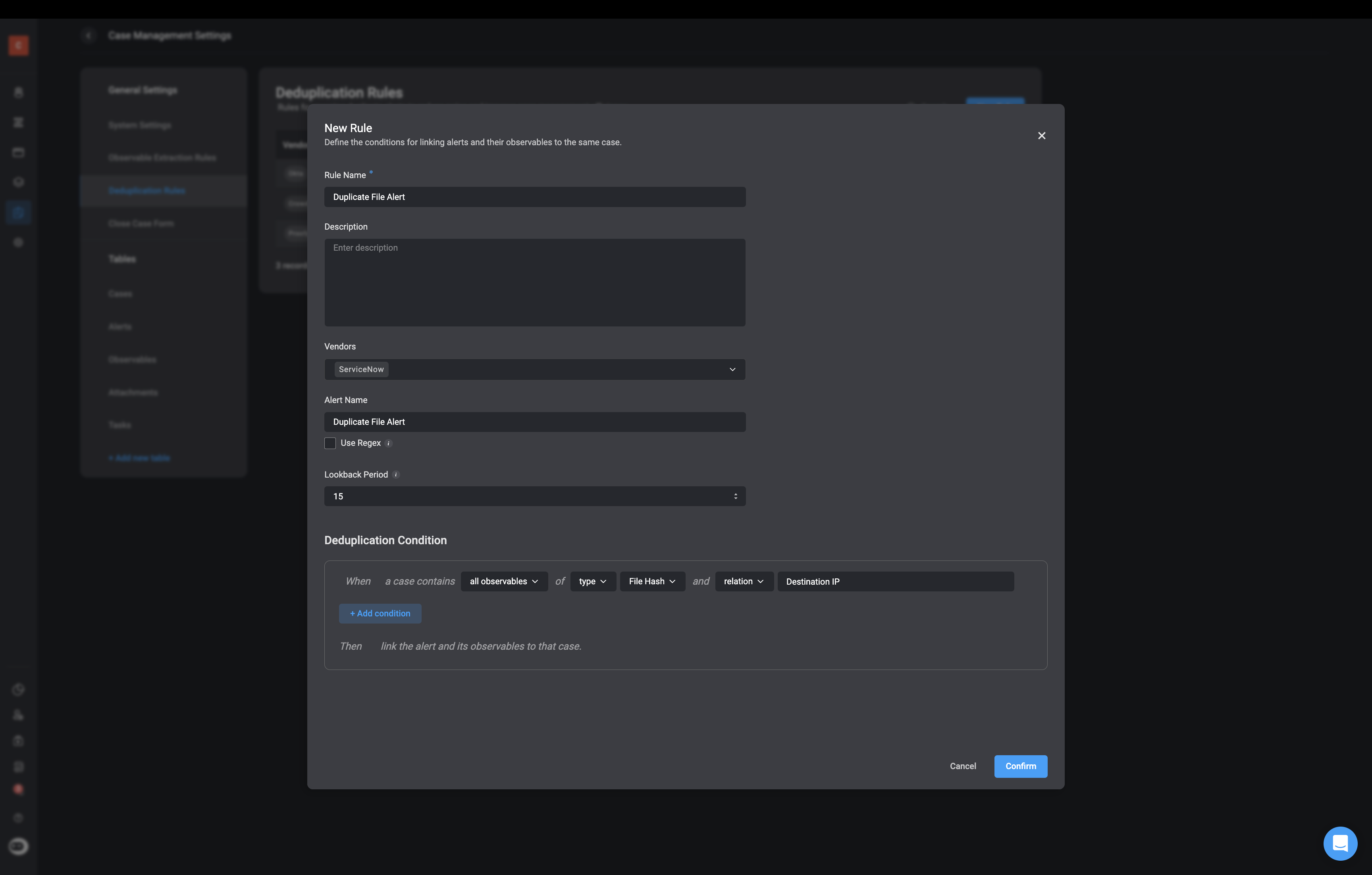 This reduces alert fatigue, prevents redundant case creation, and helps analysts focus on investigating unique incidents. Users can configure deduplication rules based on fields like alert type, source, severity, or custom attributes, allowing for precise control over how alerts are consolidated into cases.