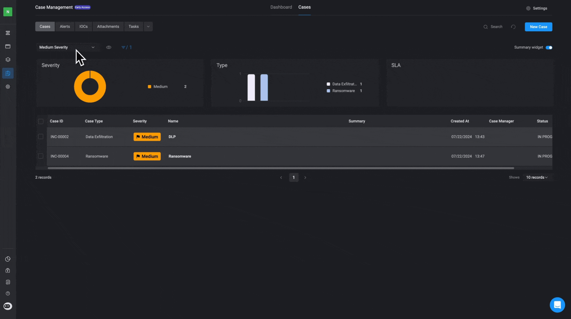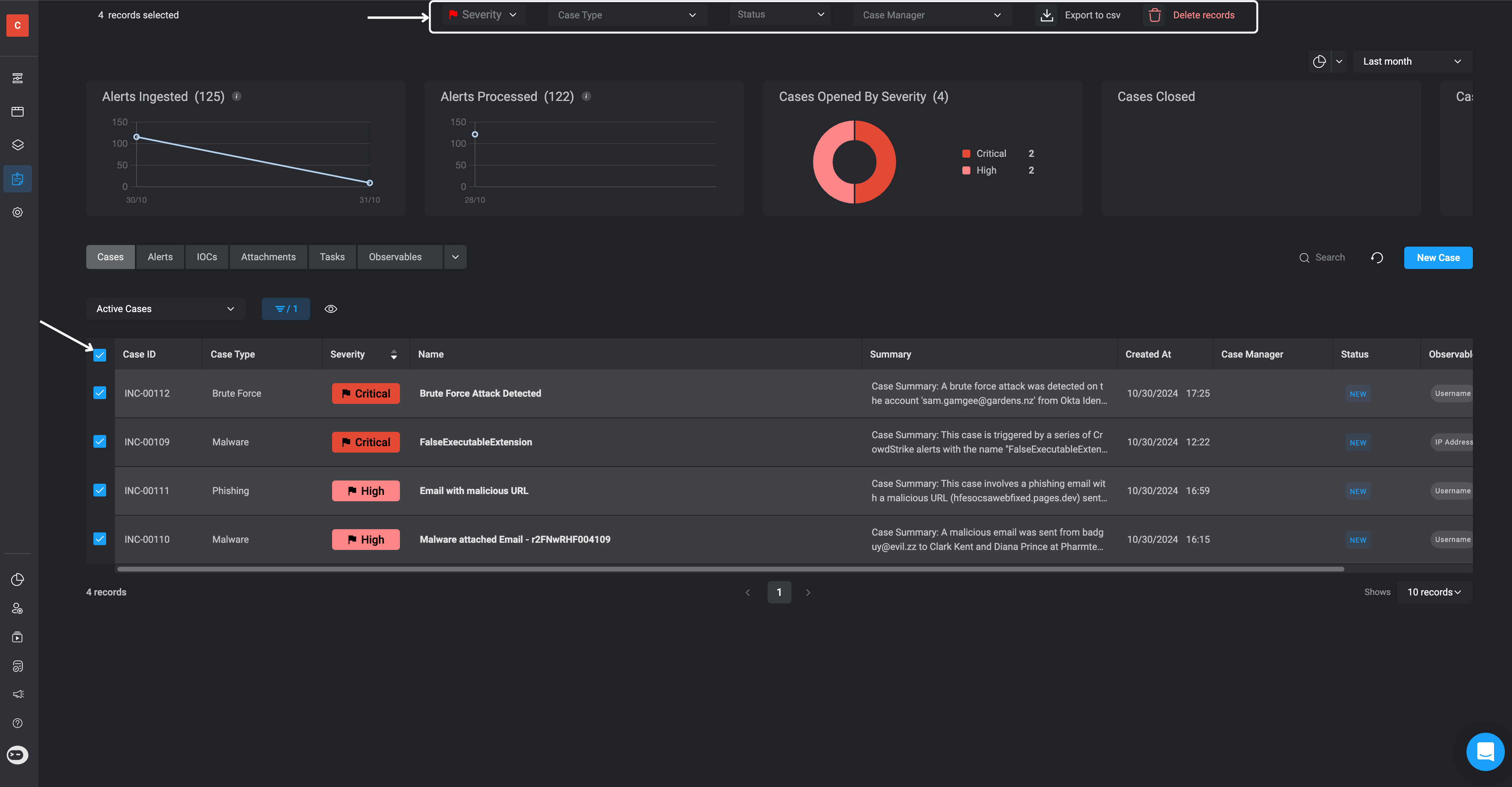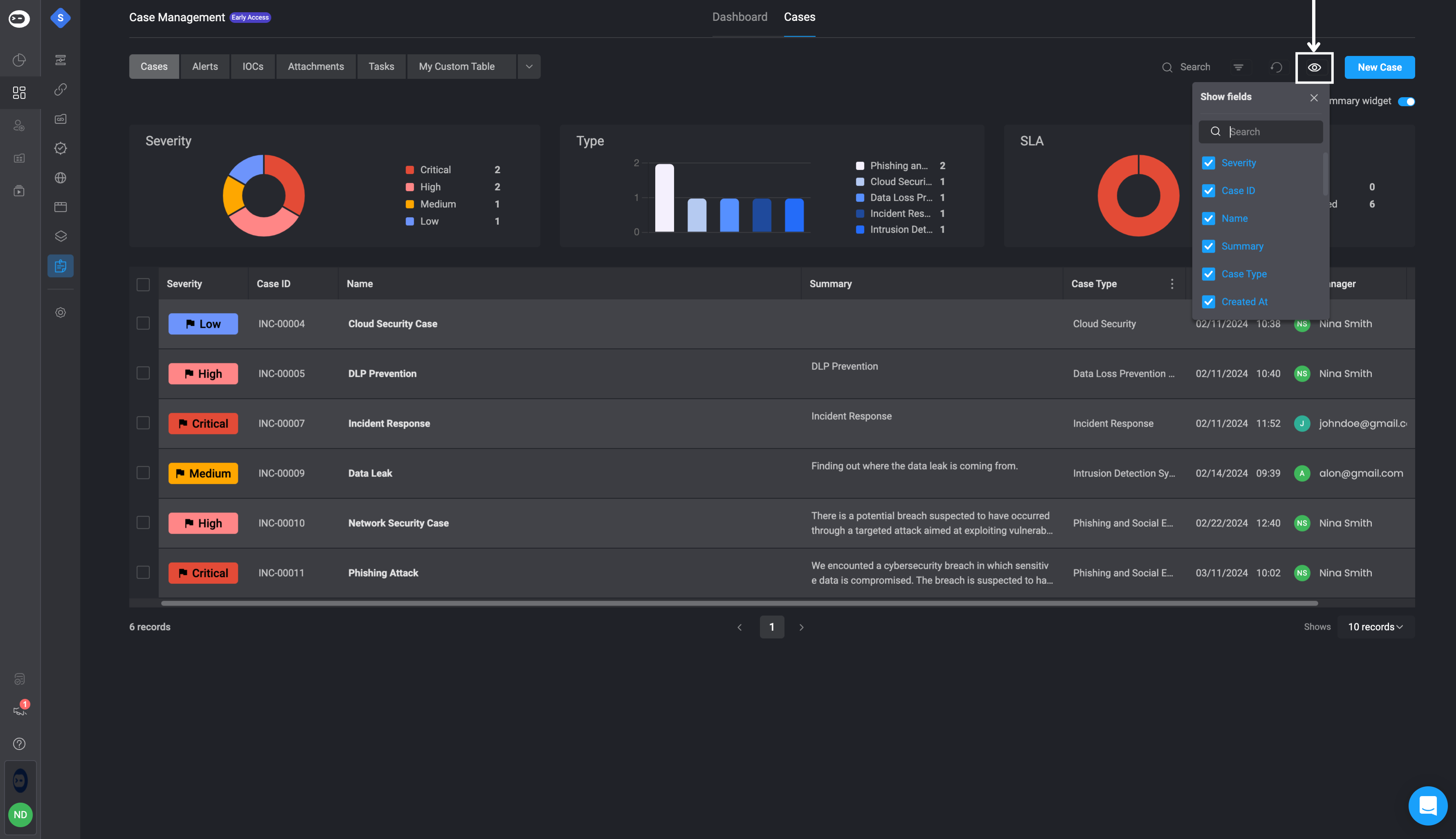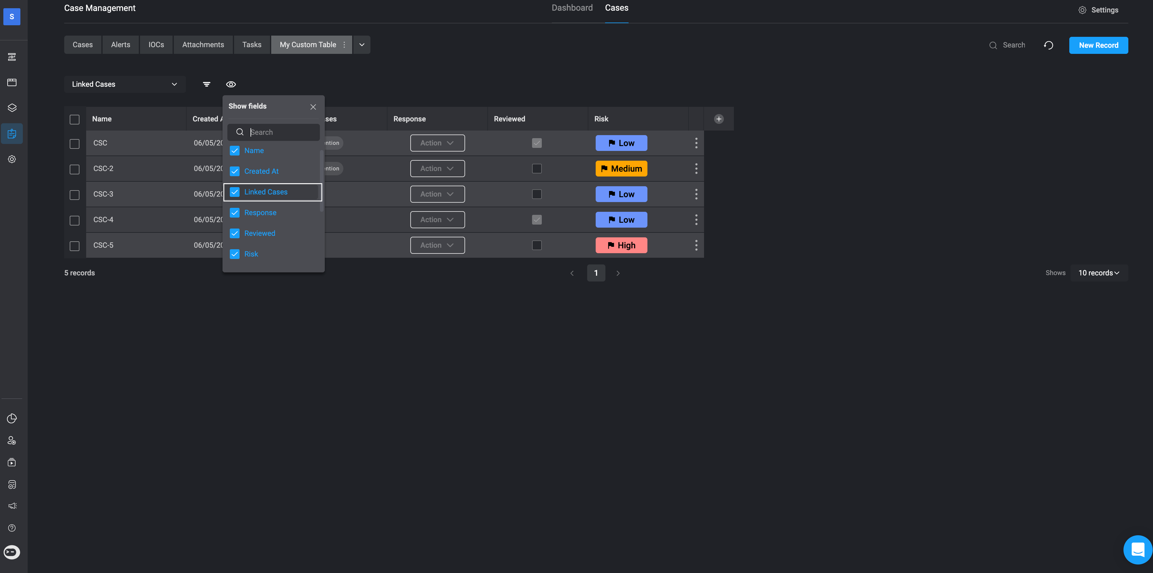 The Case Management interface includes multiple interconnected tables, Cases, Alerts, Attachments, Observables, and Tasks, each designed to help you track and respond to security incidents with precision. This section of the documentation explains the universal features available across all tables in the Case Management interface. Regardless of which table you are viewing, you can access the same set of management tools to organize, filter, and take action on records efficiently.