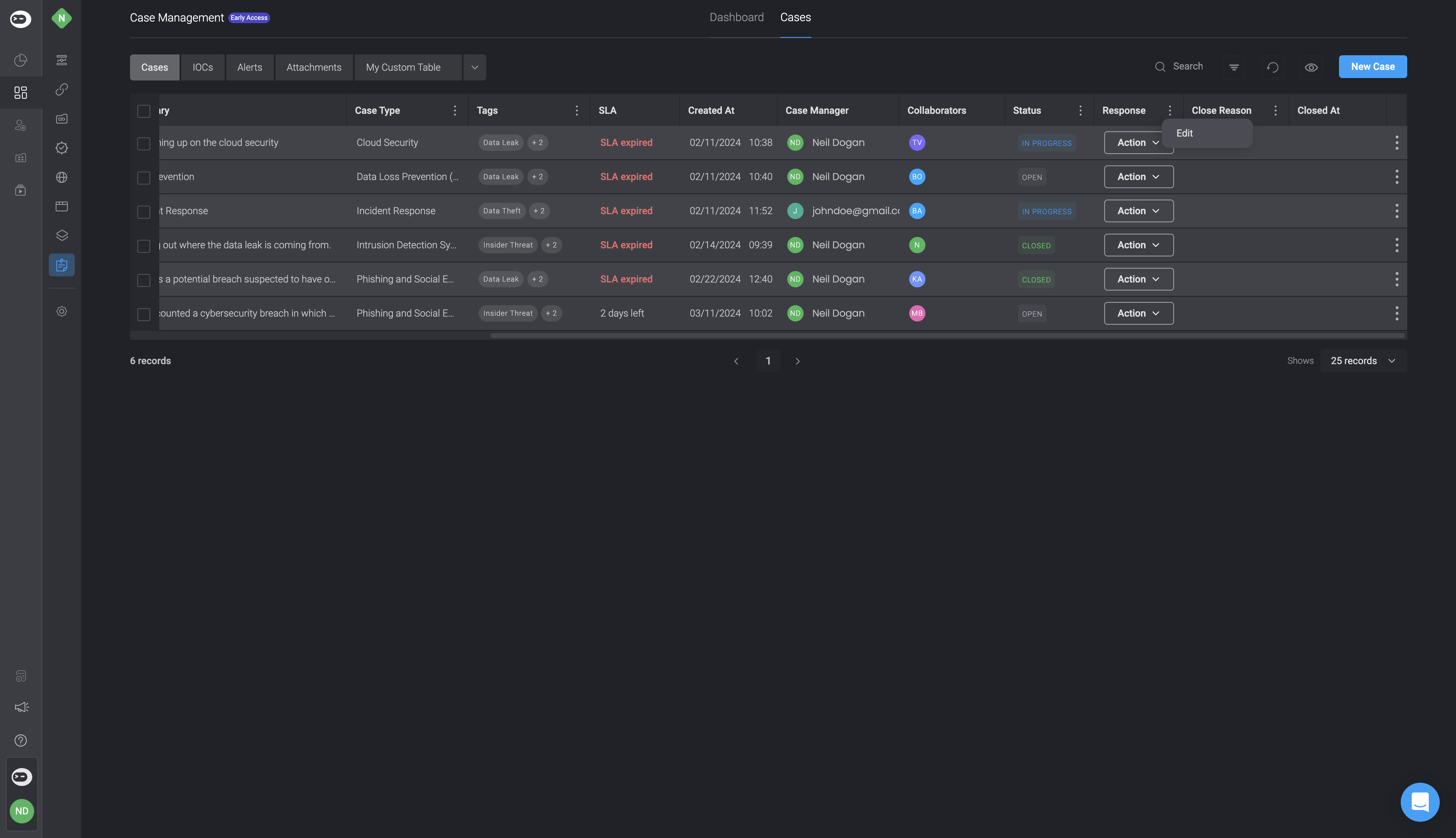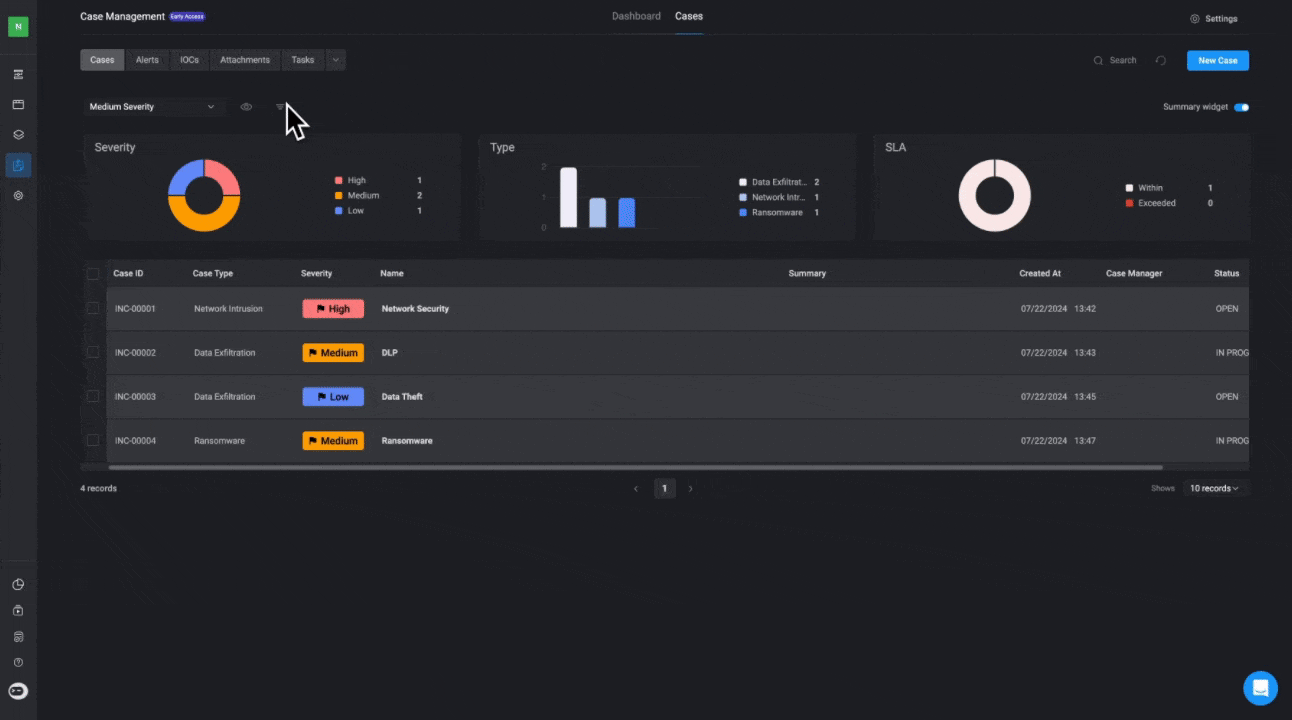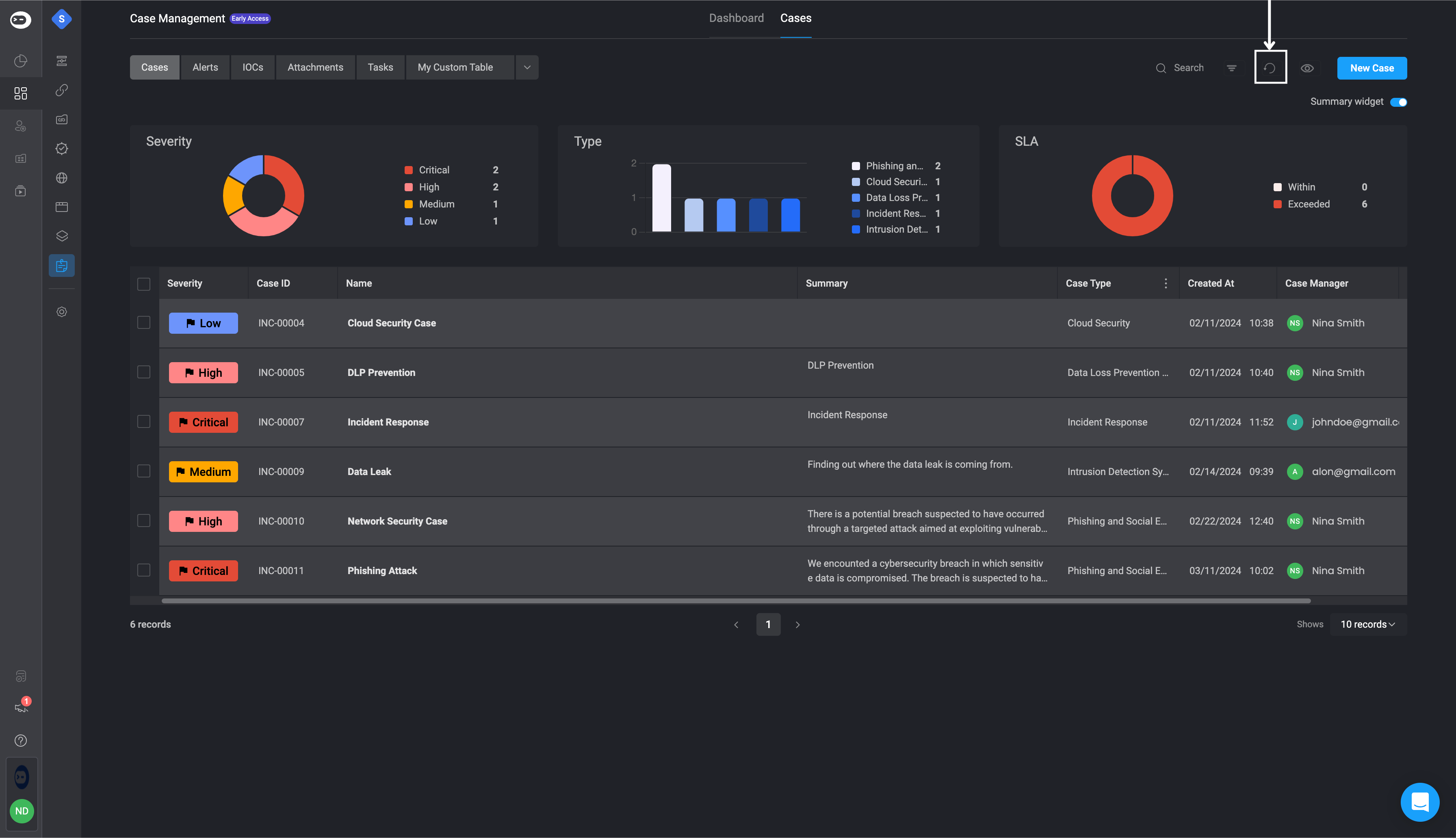 The Case Management interface includes multiple interconnected tables, Cases, Alerts, Attachments, Observables, and Tasks, each designed to help you track and respond to security incidents with precision. This section of the documentation explains the universal features available across all tables in the Case Management interface. Regardless of which table you are viewing, you can access the same set of management tools to organize, filter, and take action on records efficiently.