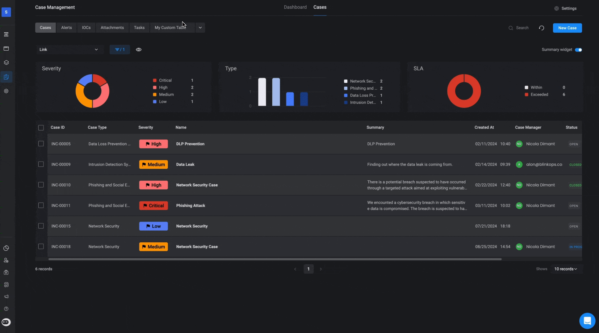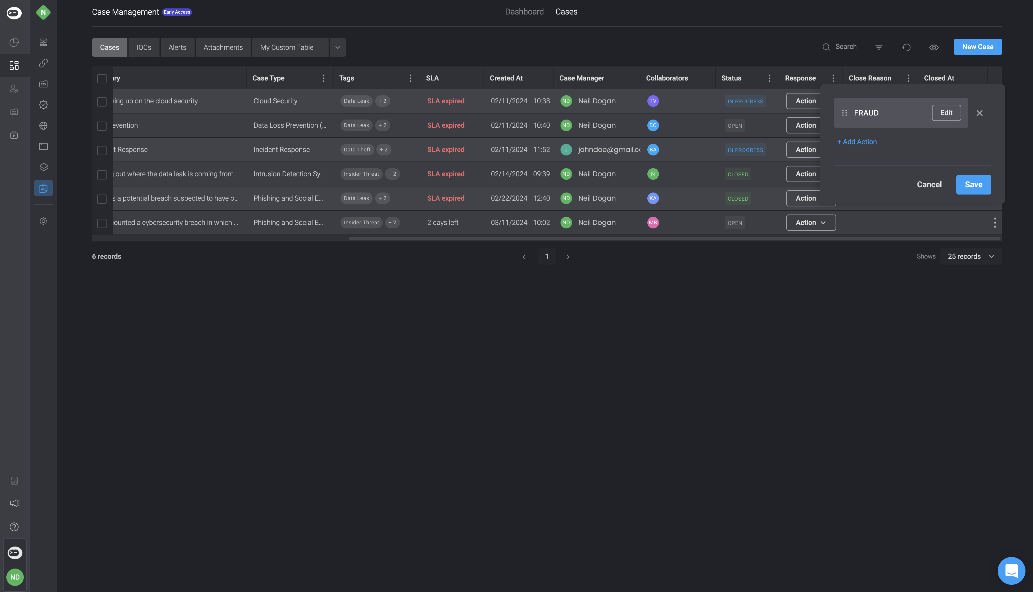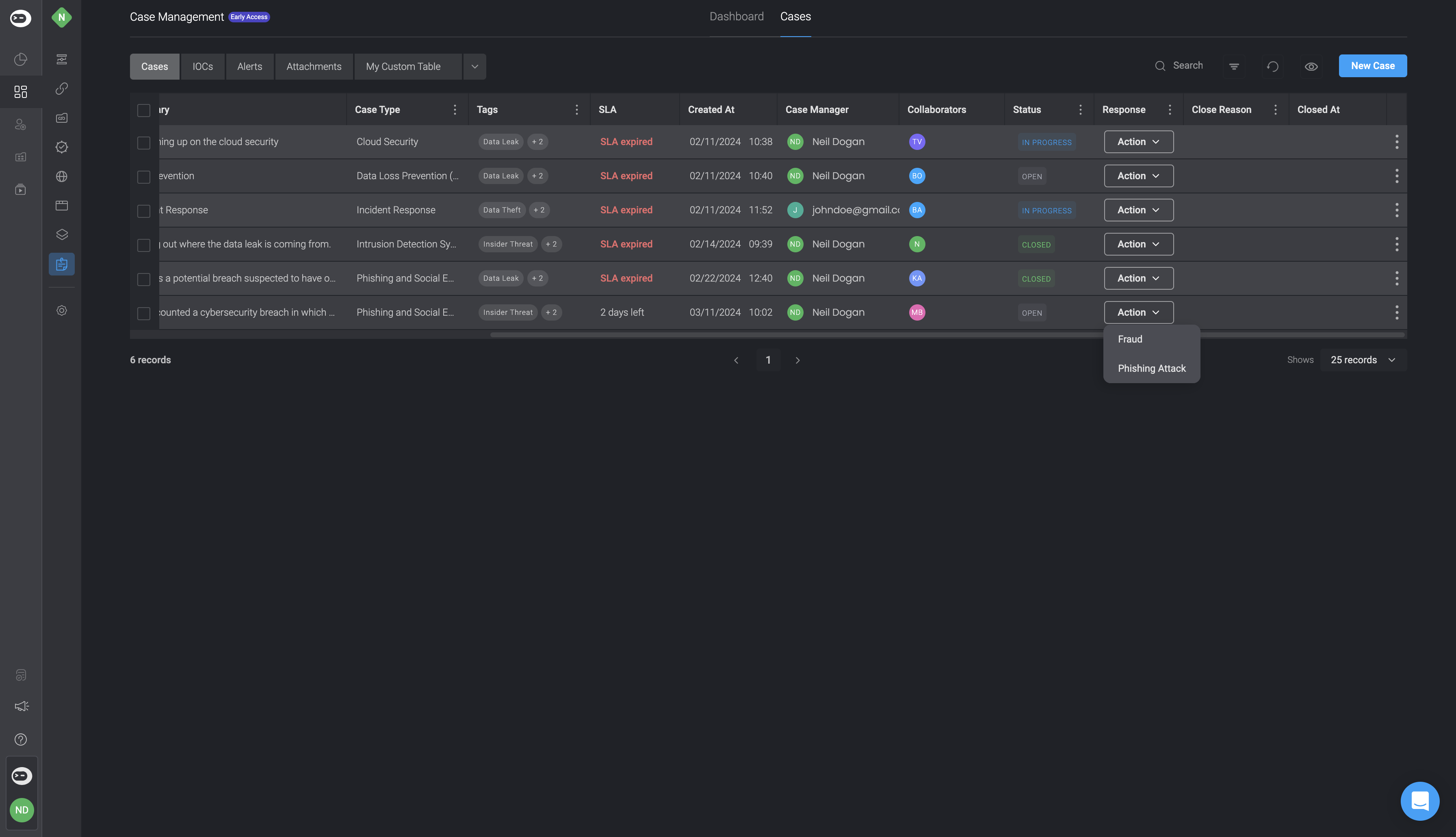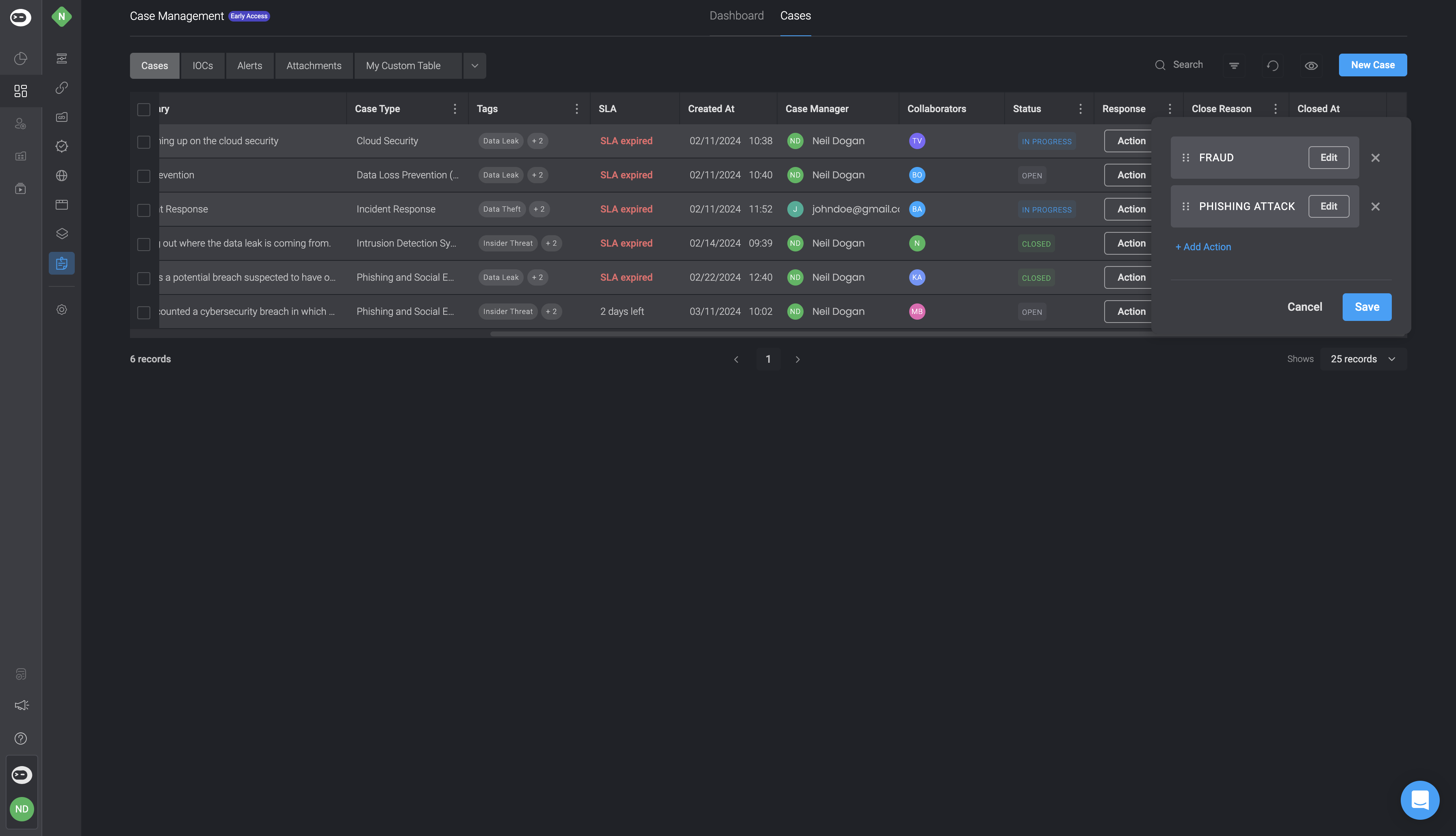 The Case Management interface includes multiple interconnected tables, Cases, Alerts, Attachments, Observables, and Tasks, each designed to help you track and respond to security incidents with precision. This section of the documentation explains the universal features available across all tables in the Case Management interface. Regardless of which table you are viewing, you can access the same set of management tools to organize, filter, and take action on records efficiently.