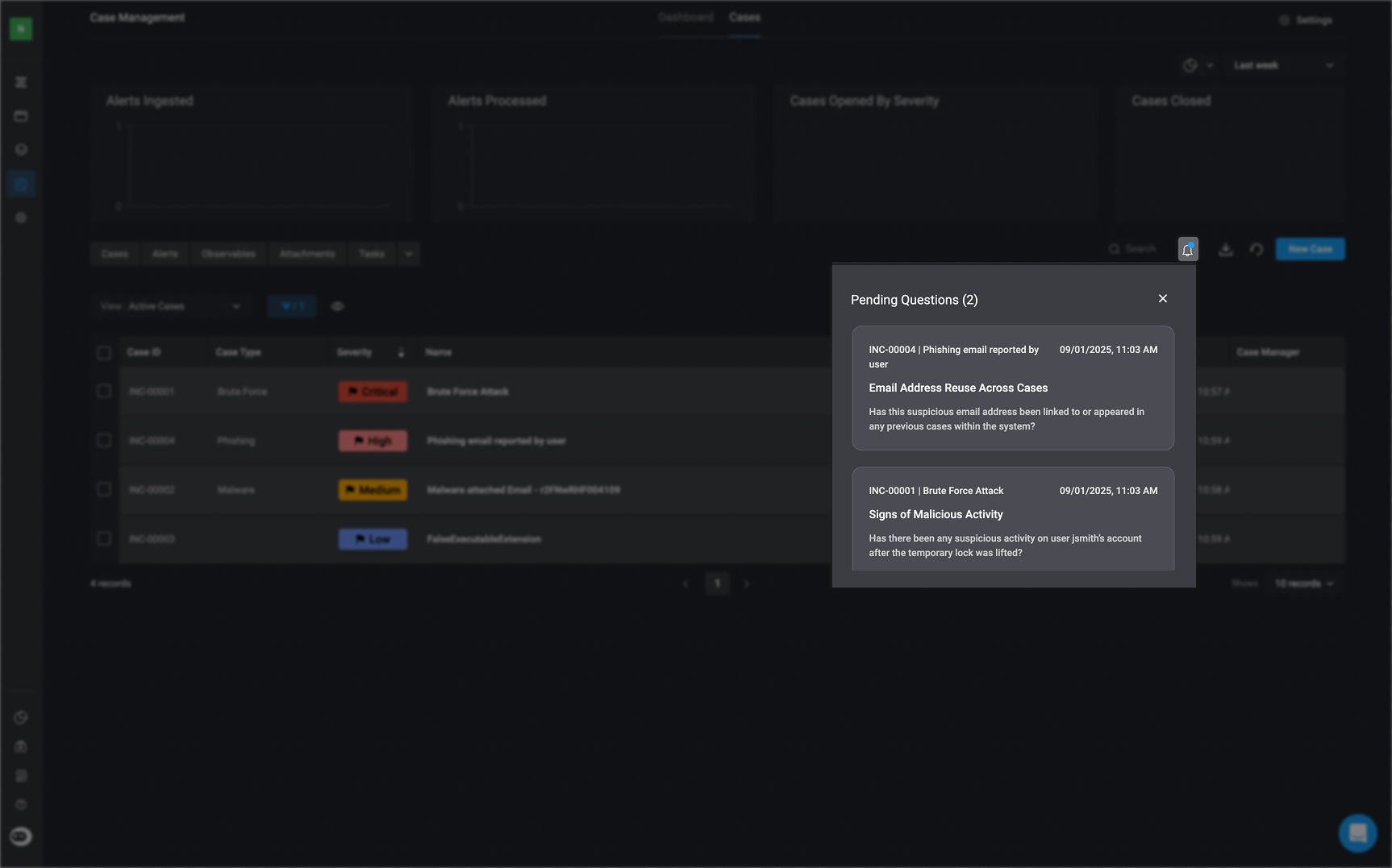 In the top-right corner, click the to view all questions submitted through the Ask a Question on a Case action. Each question is tied to a specific case. Clicking on a pending question will take you directly to that case’s overview, where you can review the details and provide your response.