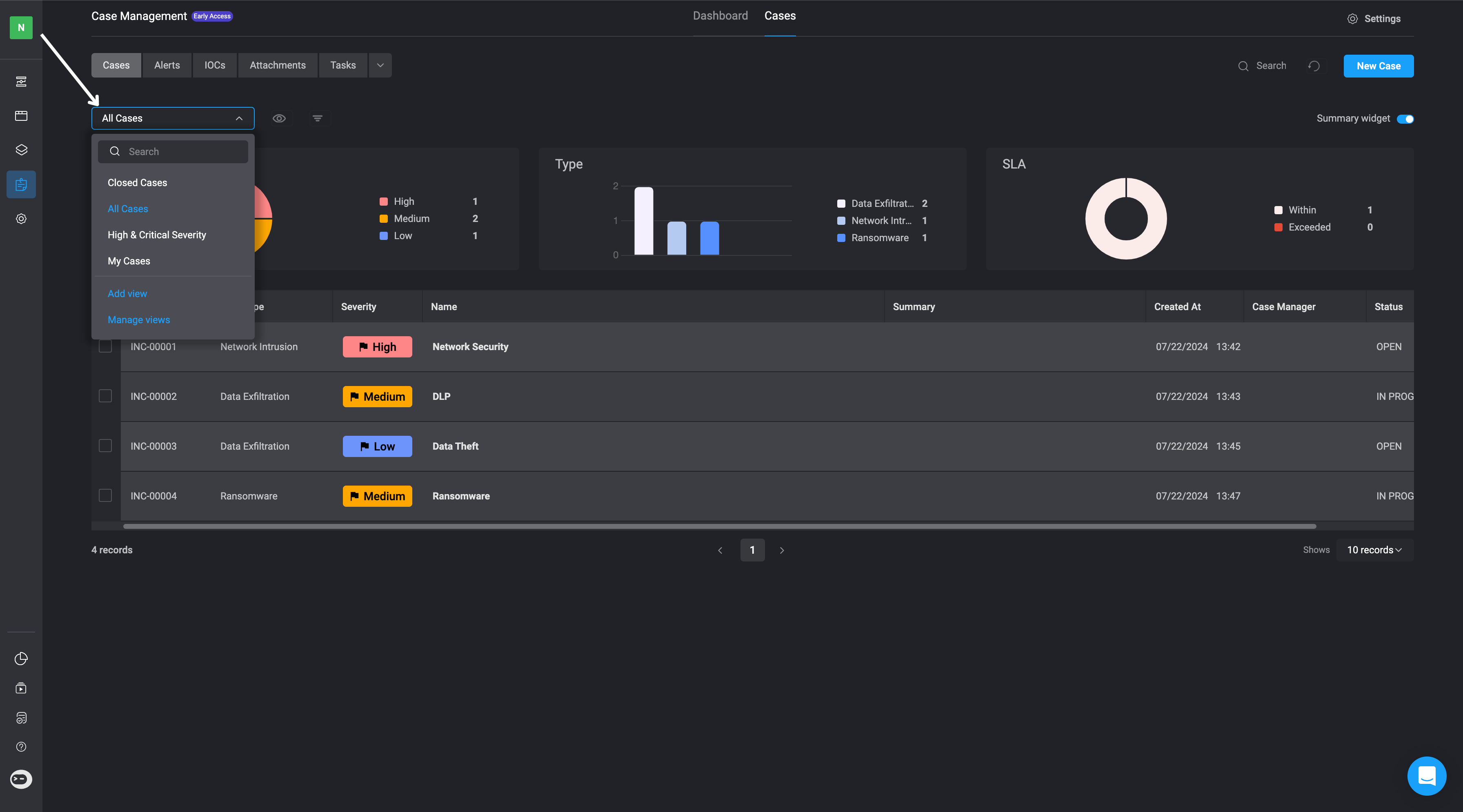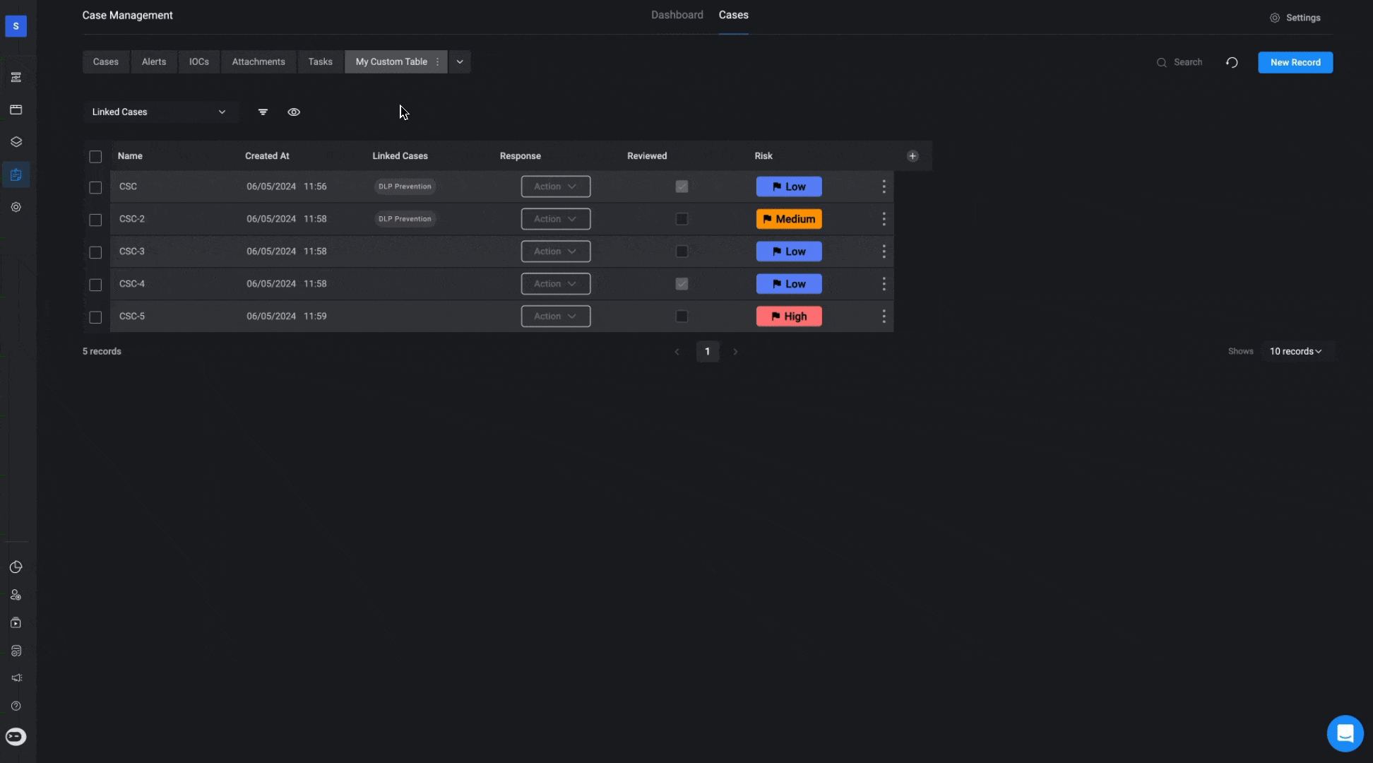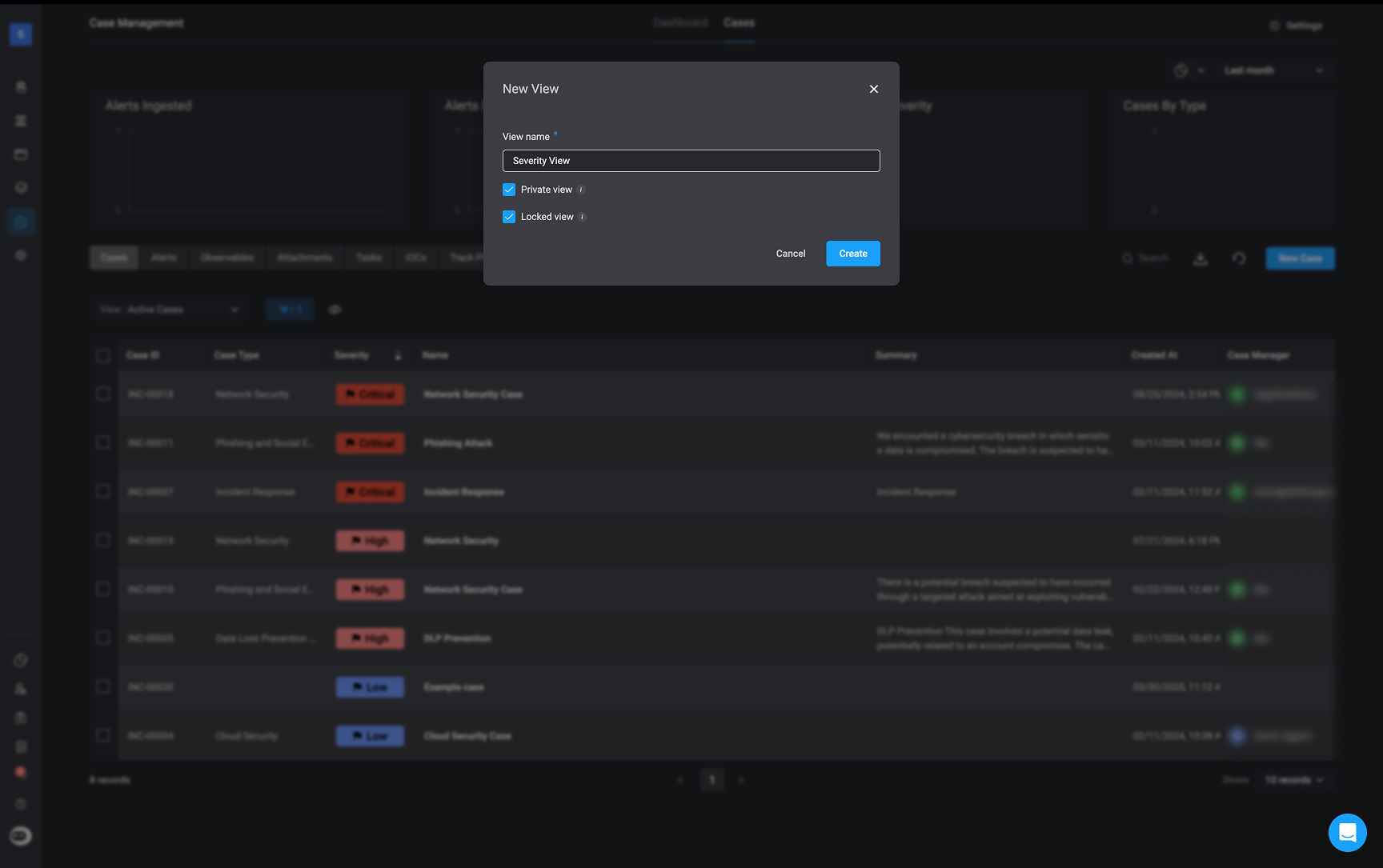 Create and manage personalized or shared table views. Each table offers pre-configured views (e.g., All Cases, My Tasks, Critical Alerts) and lets you create custom views with filters and layout preferences.Instructions: Configuring Table Views