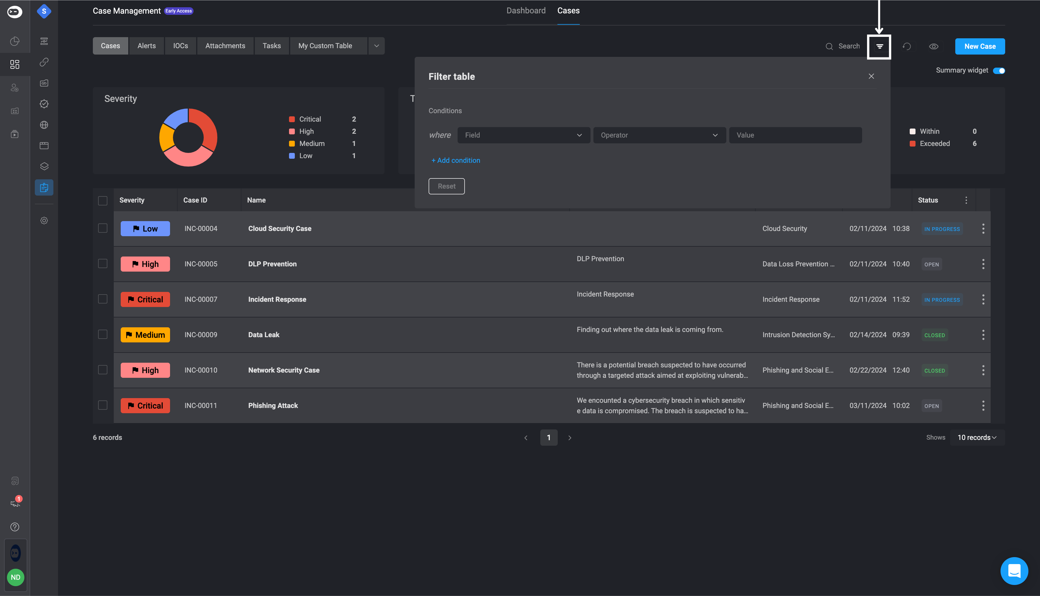 The ‘Filter’ button simplifies filtering through case(s) by applying conditional statements to find the specific case(s) you are looking for.
