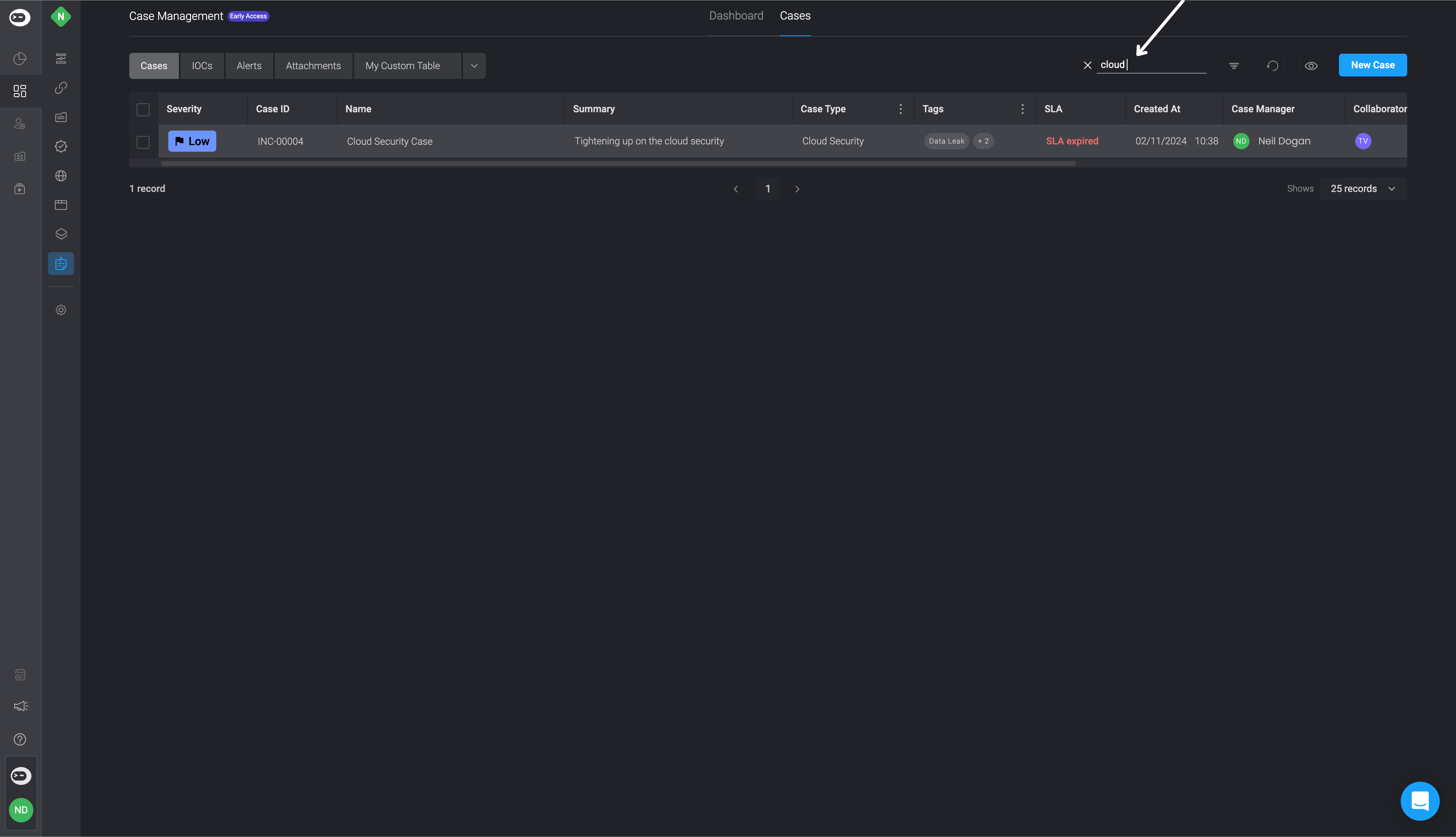 Quickly find records by name, tags, and other metadata. Use the search to find records by entering keywords such as case names, tags, vendors, or overviews.