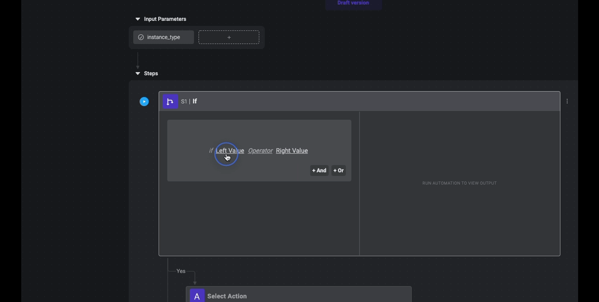 You have created an Automation with Input Parameters. Proceed to create the Steps of your Automation as described in the following section.Step 1: Using an if Step to control the workflow