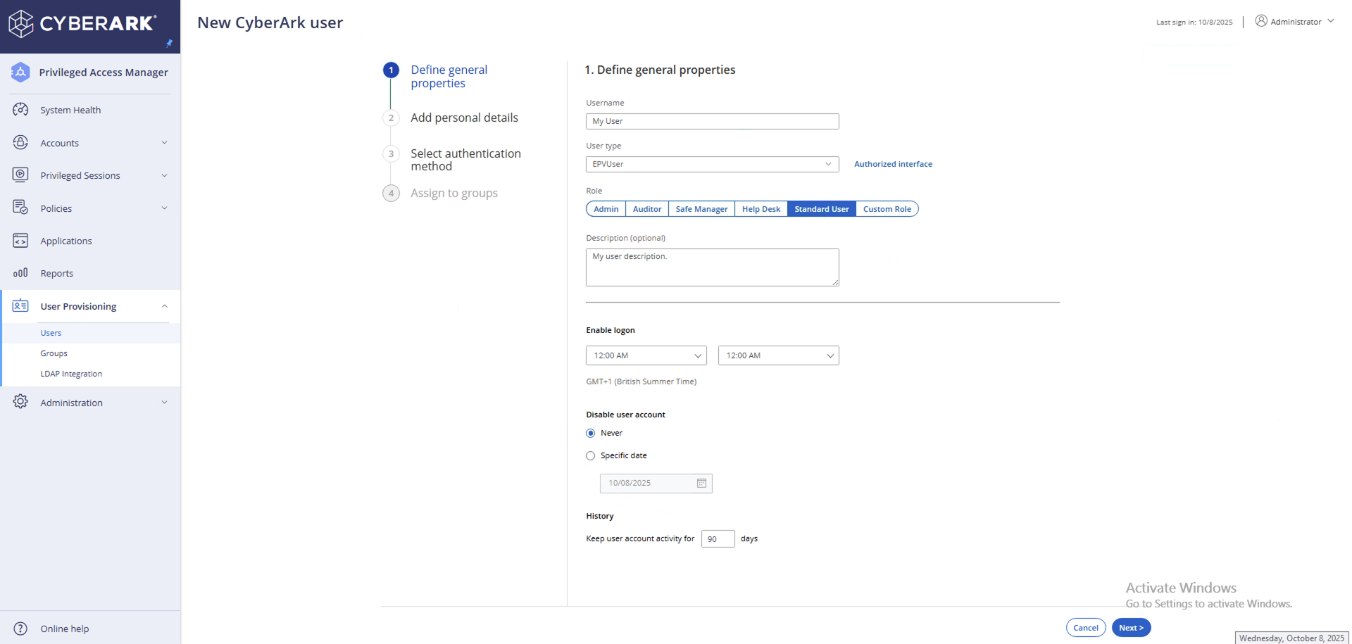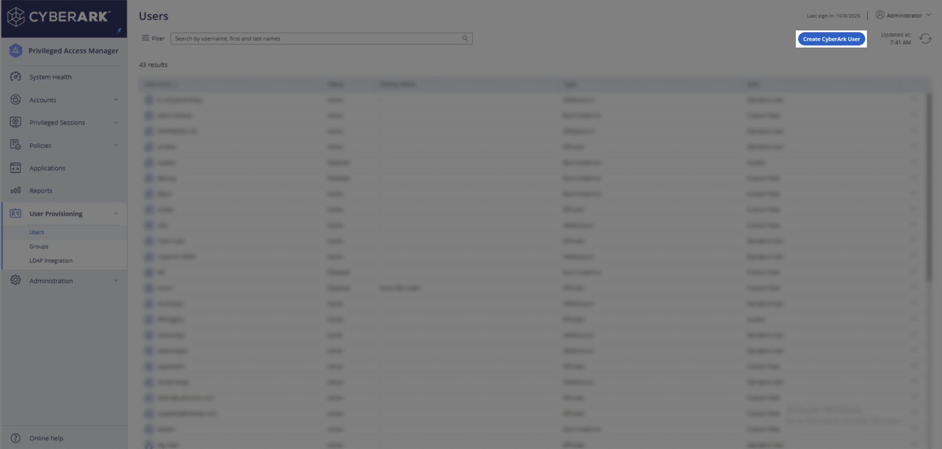 - Click the Create CyberArk User button in the top-right corner.