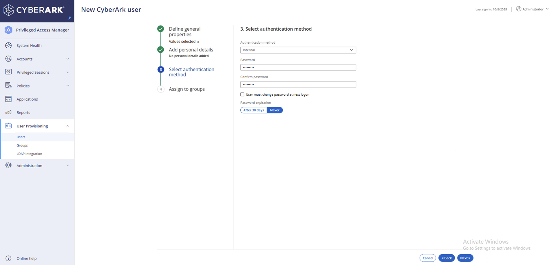 - Select password expiration settings - Never.